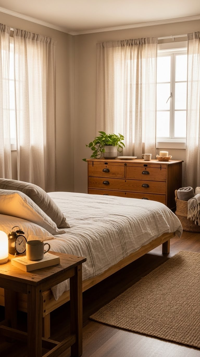 Create a wrapped-in feel. Add heavy curtains around the bed. Use ones you have. This blocks light and adds warmth. Layer blankets for extra coziness. Try a DIY: Hang fabric panels with clips. It costs nothing extra. These elements make rest easy.