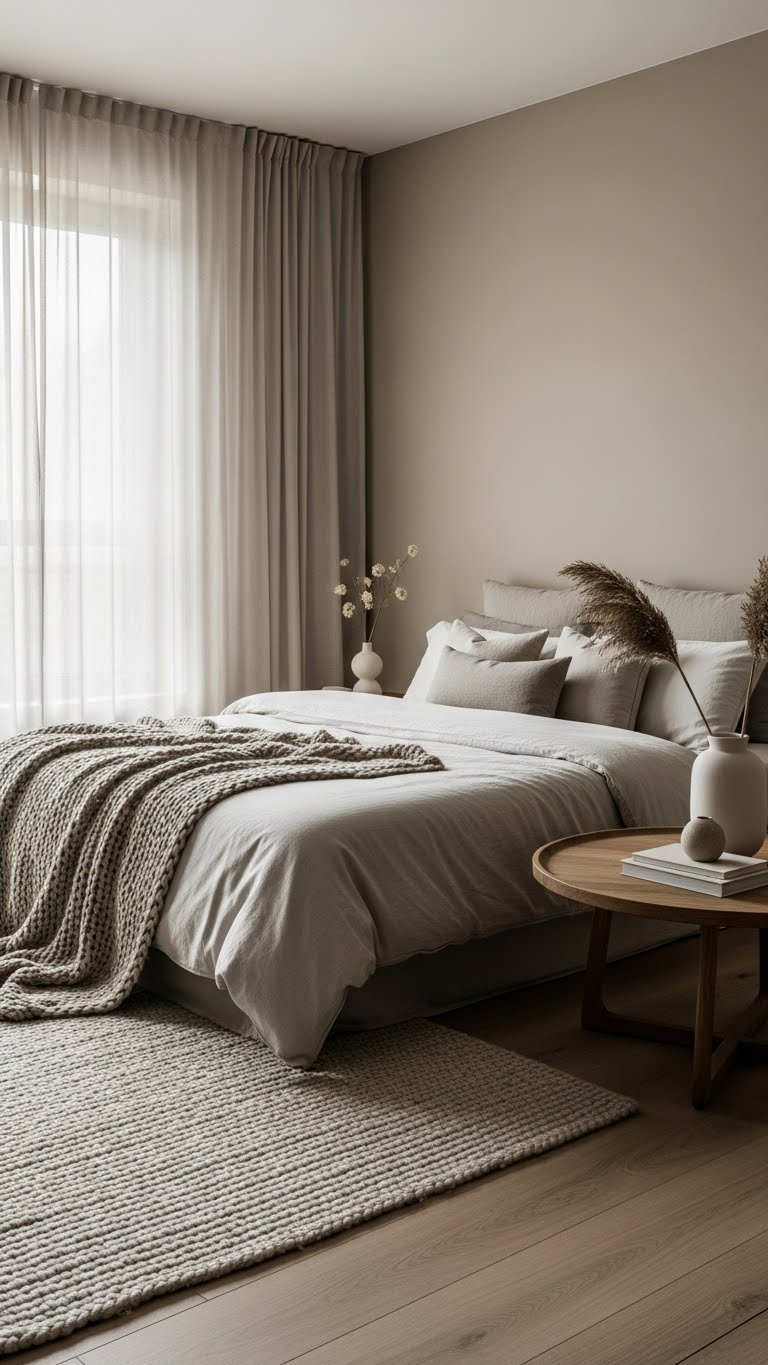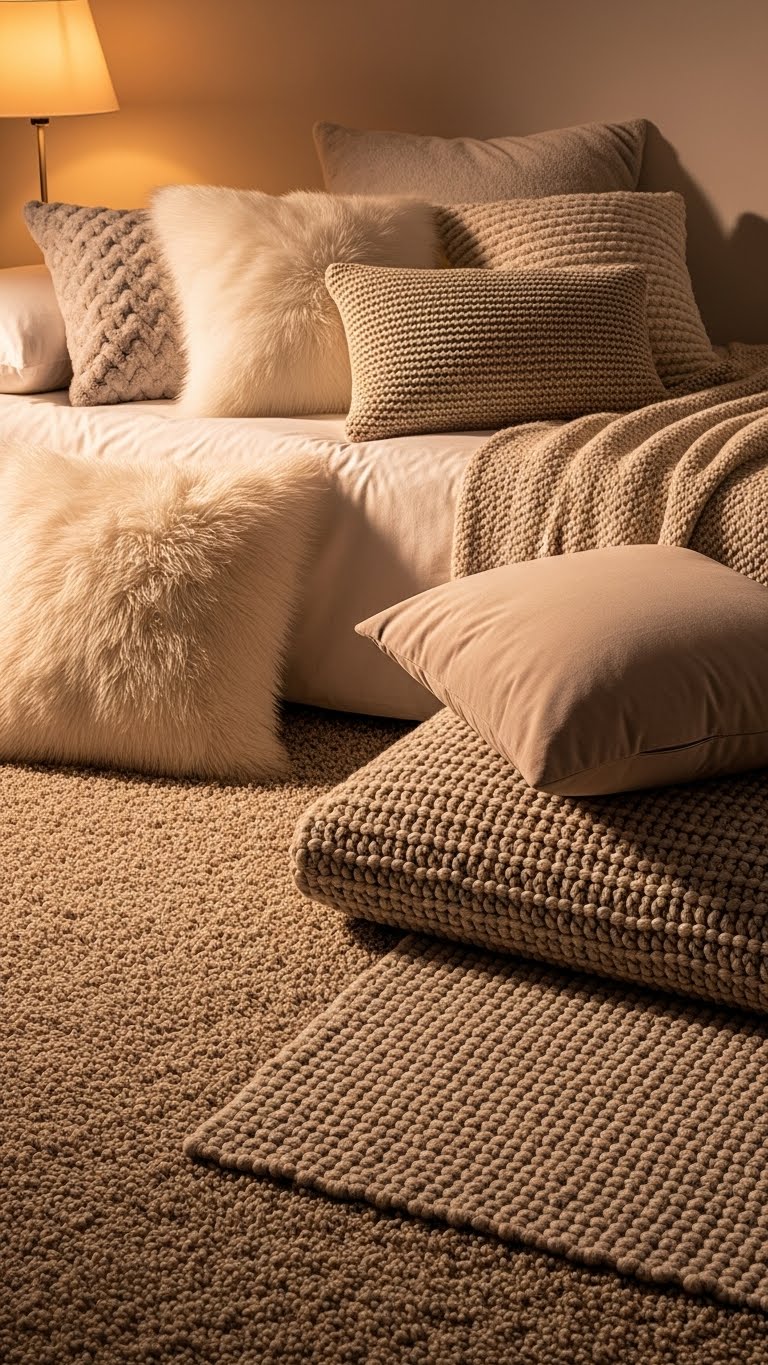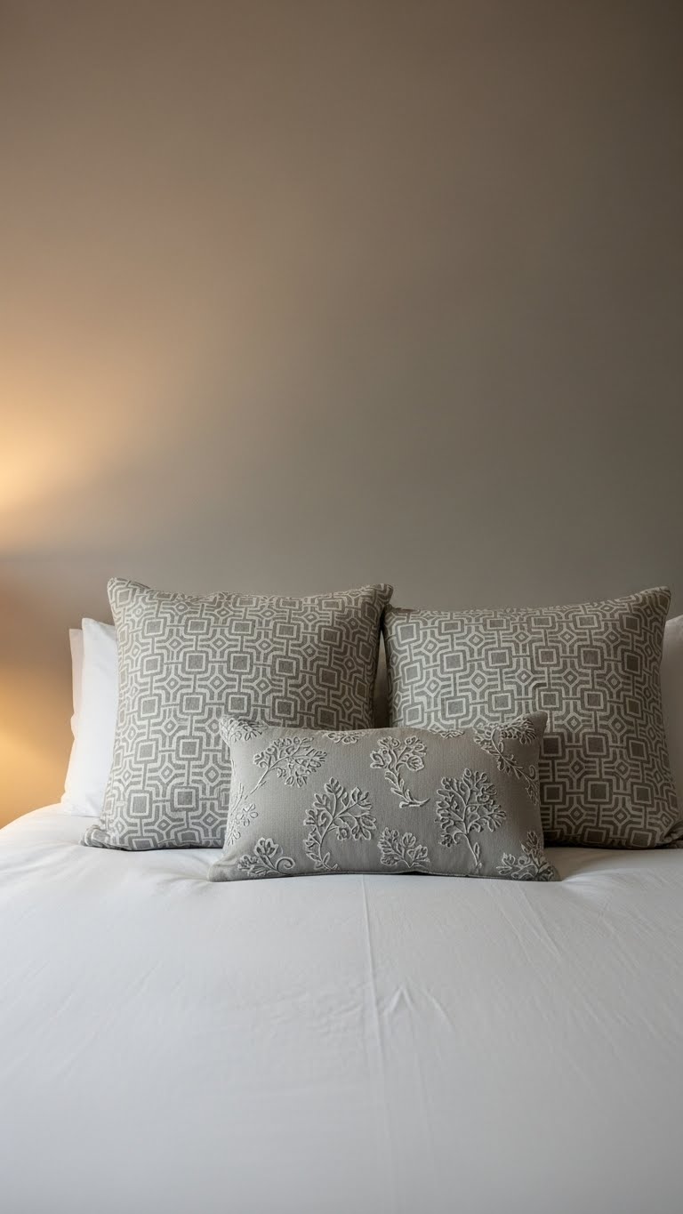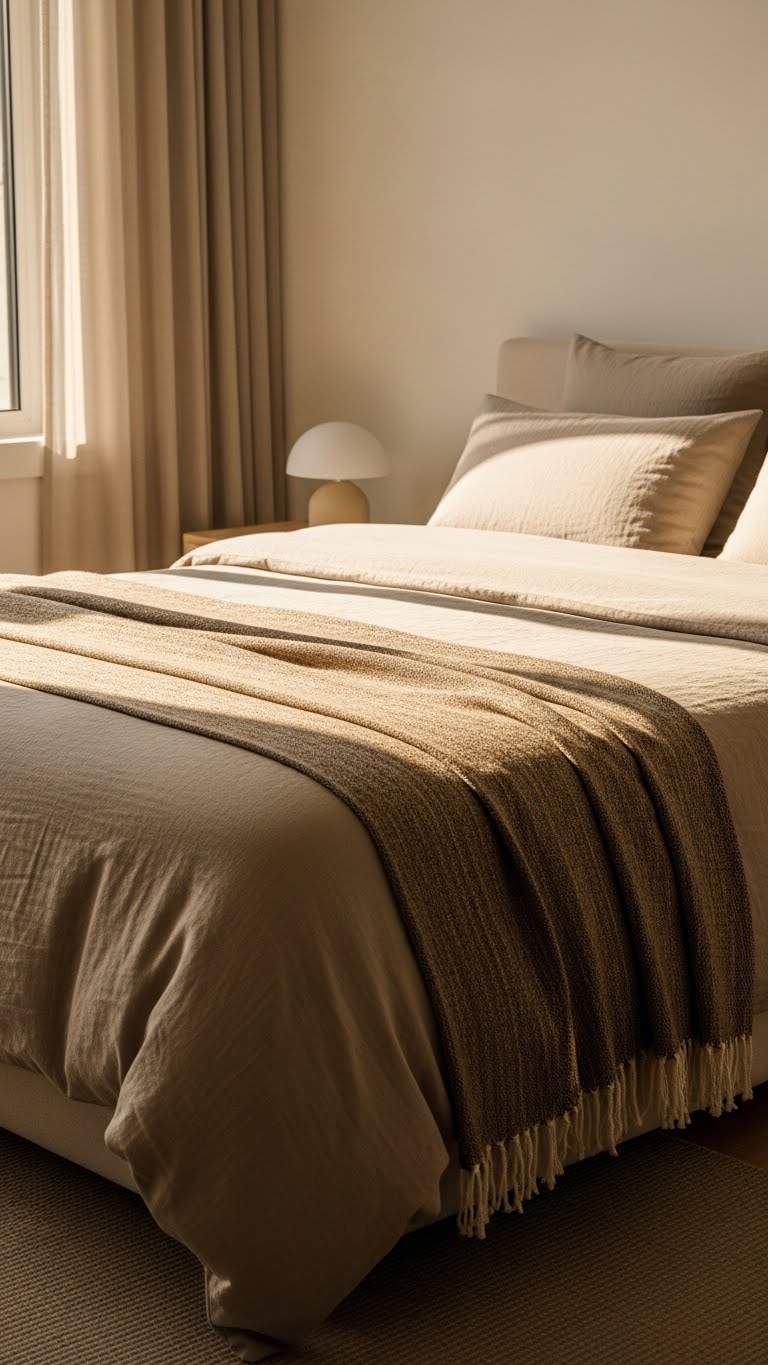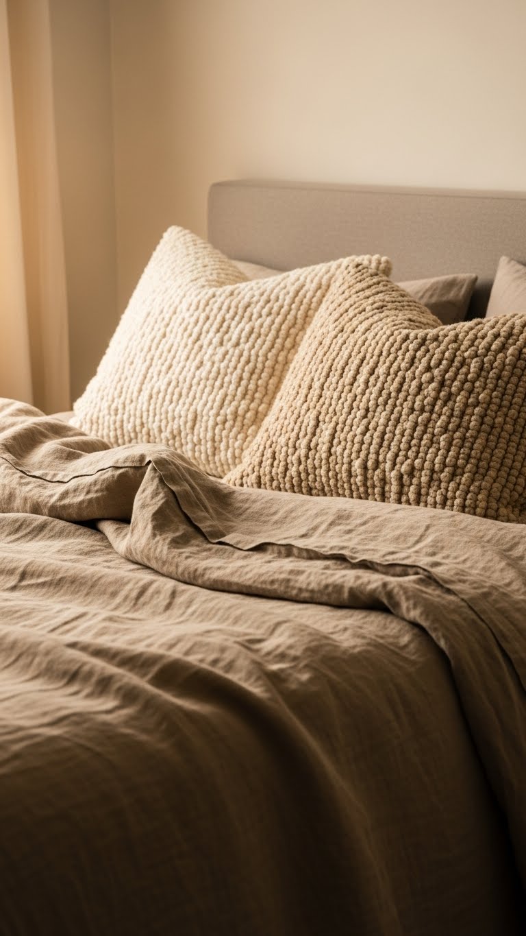 Textures add depth without fuss. Start with a velvet throw from a budget shop. It might cost $20. Layer it over your bed with linen sheets. Mix in a bouclé pillow for contrast. Find one online for $10. This makes neutrals feel rich. Feel the fabrics first to see what you like. Use what you have at home. Swap out old covers for these. It refreshes the bed in minutes. Try a DIY: Sew simple pillowcases from spare cloth. Basic thread and a needle work fine. These layers create a cozy feel. They elevate everyday comfort. Keep it balanced for a clean look.