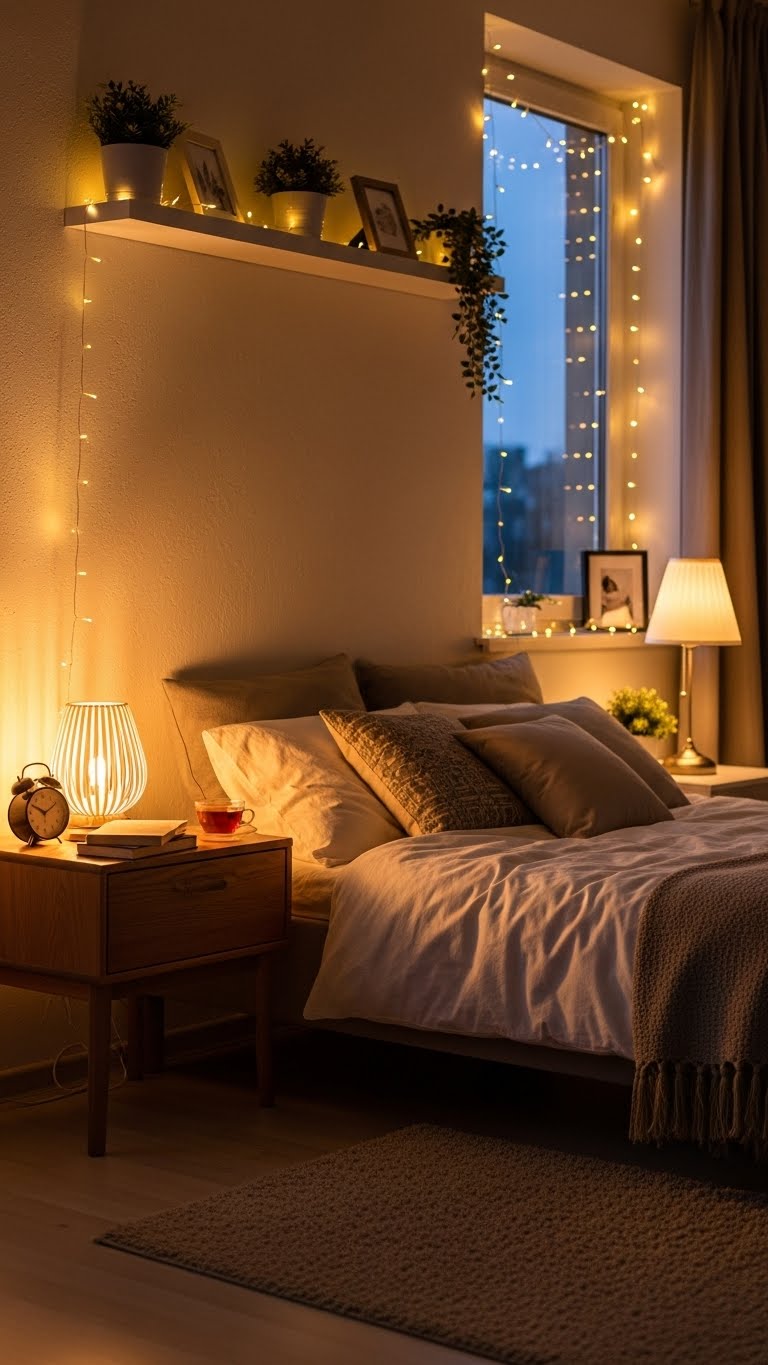 Switch to warmer lights. Buy LED bulbs for $5. Place them in existing lamps. This changes the mood right away. Drape string lights along a shelf. Find them for $10. Try a DIY: Repaint lamp shades with craft paint. It refreshes them cheap. These tweaks brighten your space.
