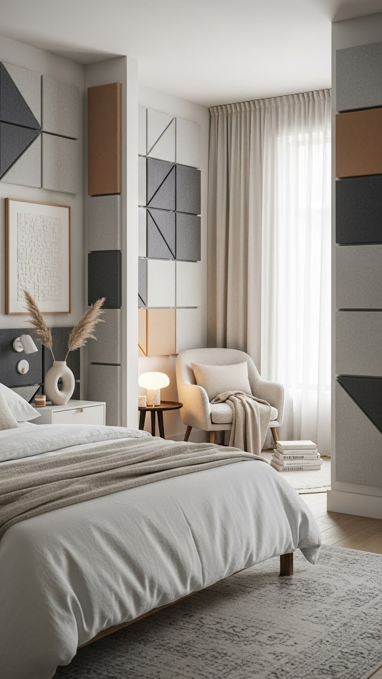 Add panels to quiet things. Use foam from crafts for $10. Place them on walls. This creates calm. Try a DIY: Cover with fabric scraps. It absorbs sound well.