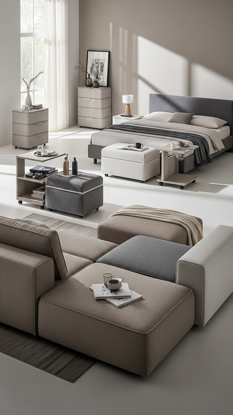 Choose pieces that move. Buy from budget stores for $50. Arrange as needed. This fits changing needs. Try a DIY: Add wheels to items. It makes shifts easy.