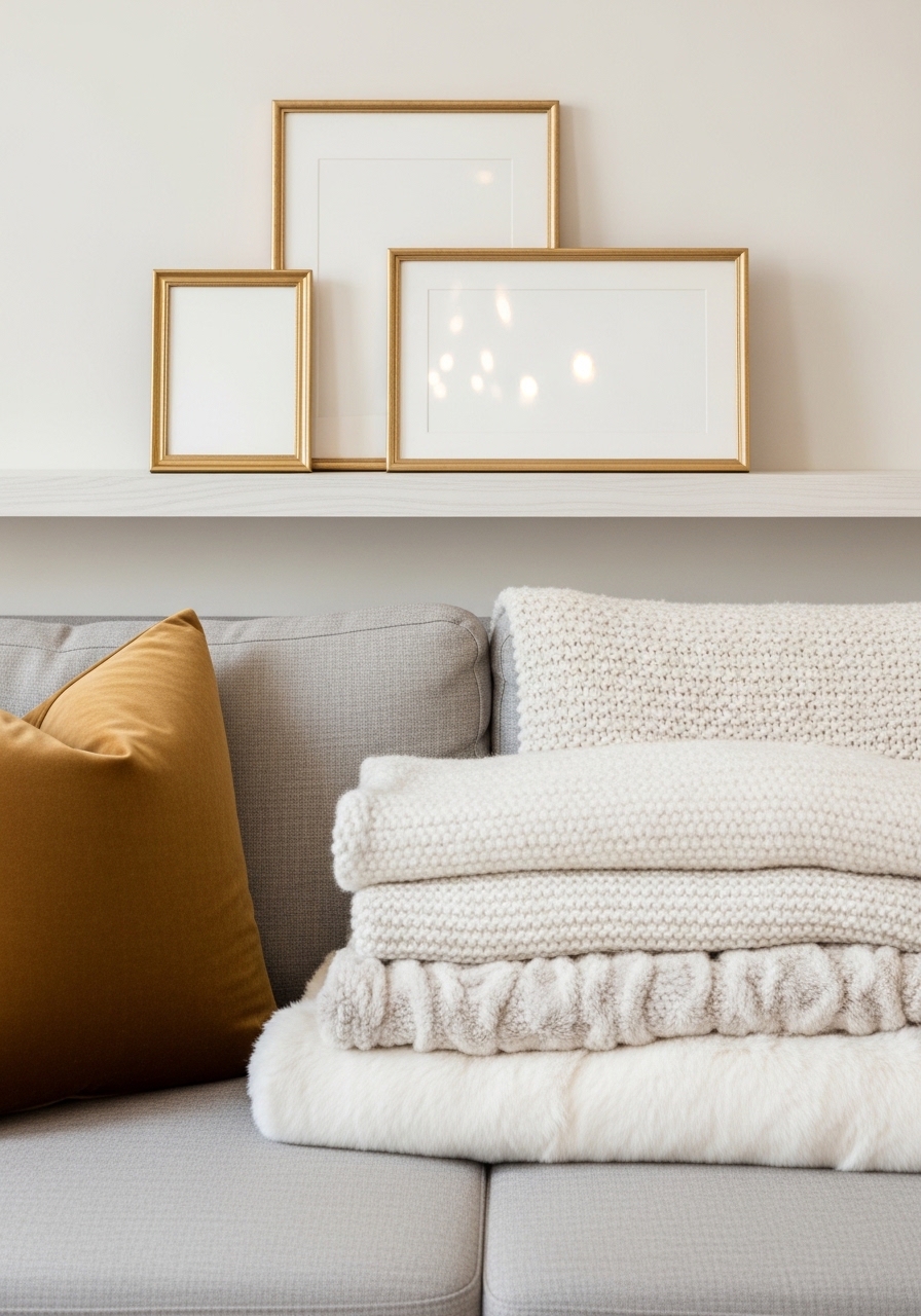 I used layered neutrals to calm the space, then added a single bold color — ochre pillows in my case. I paired linen curtains with a chunky cream throw and two velvet pillows for contrast. The key is texture ratio: two textured pieces to one smooth (2:1). Avoid matching every beige — keep one piece warm (wood or brass) so it reads intentional, not flat.
