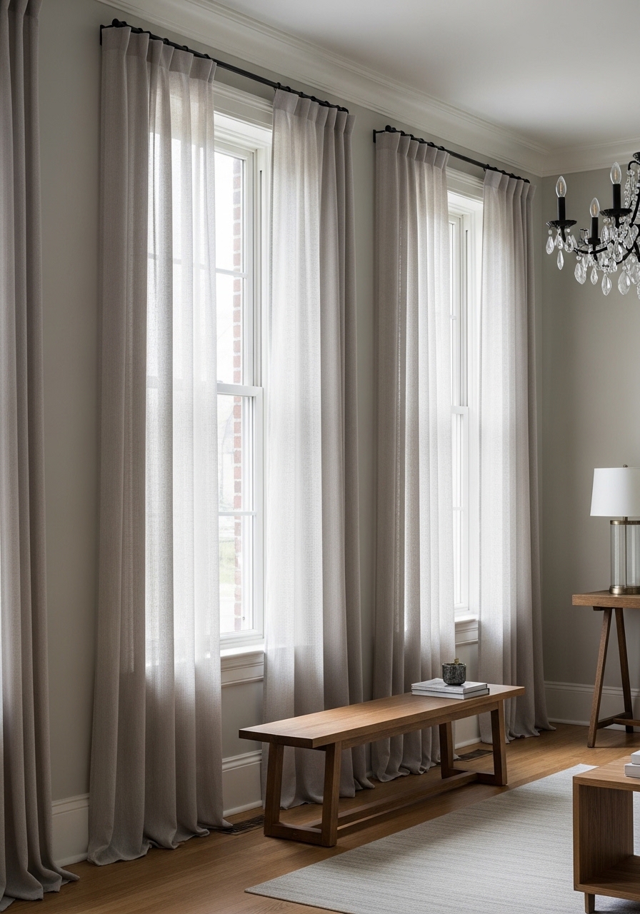 Hanging curtains so they touch the floor instantly makes a room feel taller. I hang 96-inch panels 4-6 inches above the trim. Use light-filtering linen for soft light. Common mistake: mounting too low — that shortens the wall visually. Pair with a slim round mirror to double the perceived height.