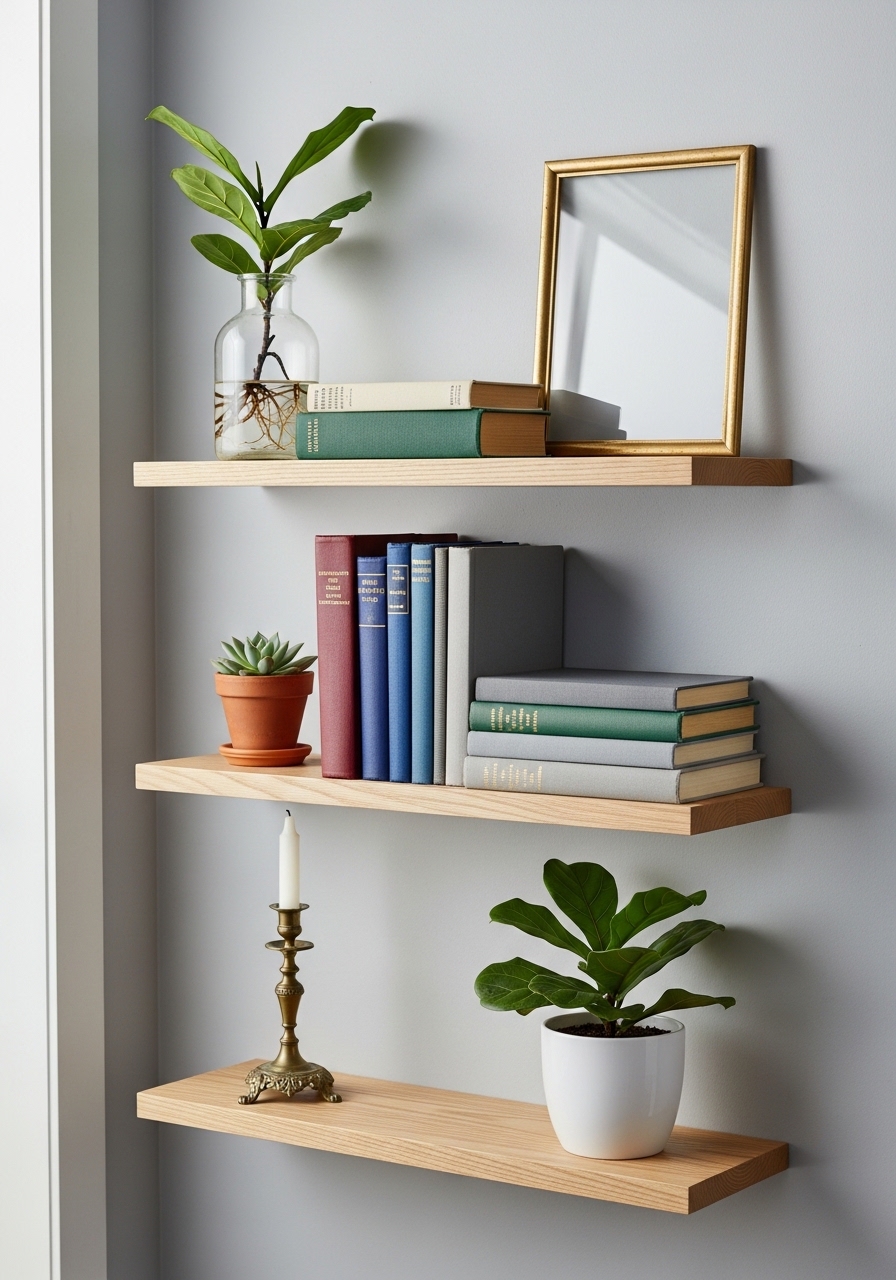 I installed white oak floating shelves and styled them with odd-numbered vignettes: plant, art, book stack. A single tall plant anchors the shelf group. Use a lightweight wall anchor for safety. Avoid overcrowding — negative space is part of the styling.