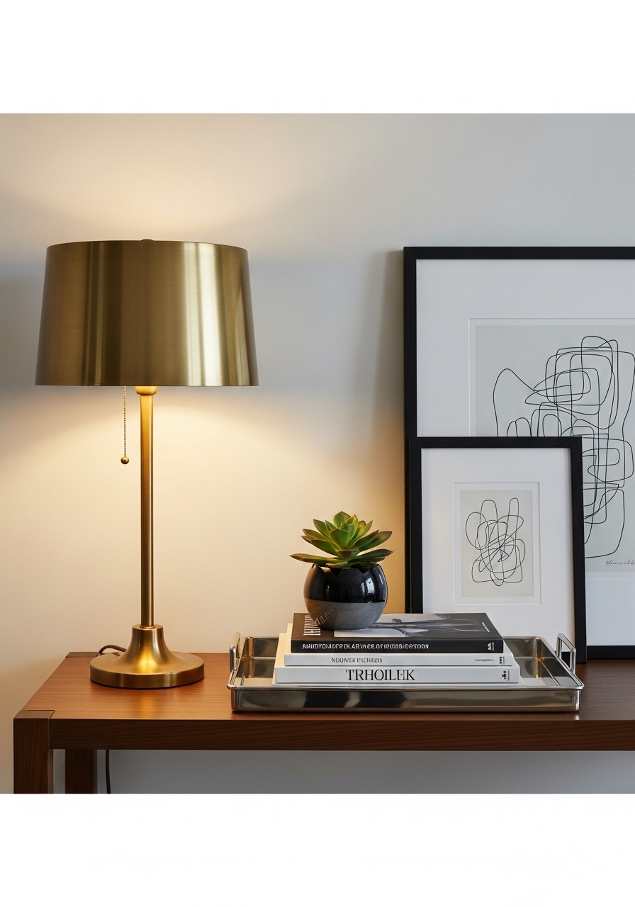 I used warm brass lighting with nickel picture frames and matte black hardware. Mixed metals add depth and keep things current — try mixed metal picture frames to start. Keep one metal dominant and add two accents. Avoid a chaotic look by repeating each metal at least twice.