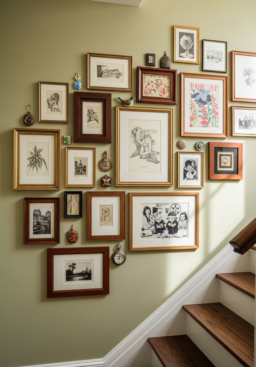I thrifted frames, then added crisp white mats bought online. Pair thrifted frames with 11×14 white mats for a unified look. Lay the layout on the floor first. Common mistake: centering every frame — embrace asymmetry for energy.