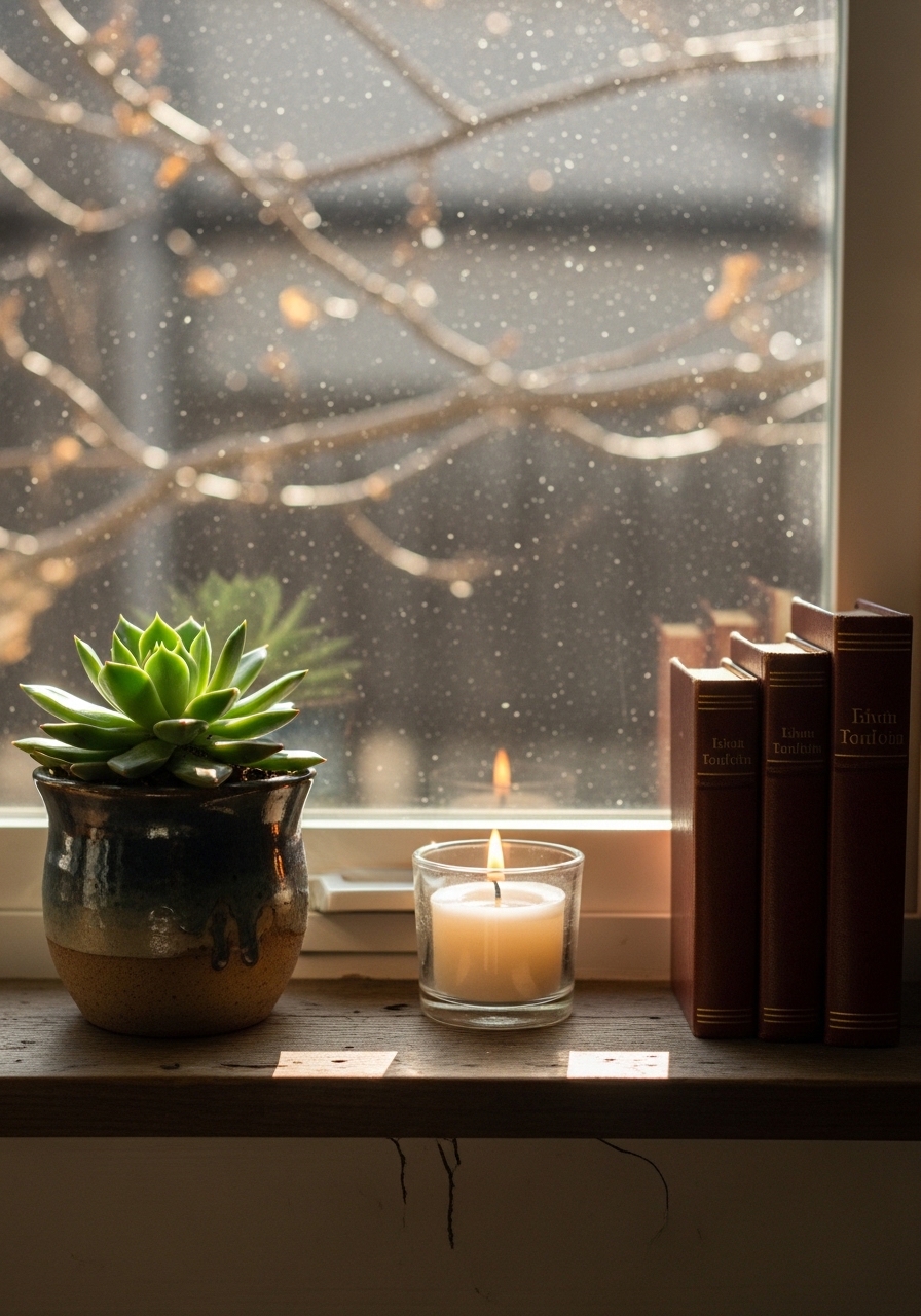 Small vignettes make everyday moments special. I use a set of succulents in ceramic pots and a thrifted candle. Keep scale small and repeat a material (clay or brass) to unify. Avoid cluttering the sill where you open the window.
