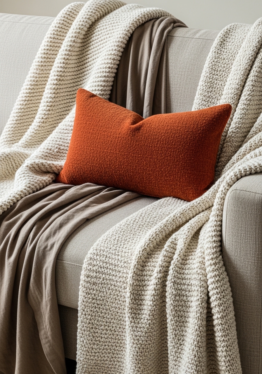 I used a cream chunky knit throw and linen curtains to build a calm base, then added a single rust-orange pillow to give the room focus. The look reads high-end because of textural contrast: smooth linen, nubby knit, and soft velvet. I recommend linen curtains 84-inch and velvet pillow covers. Styling ratio I follow: 2 neutral textures to 1 bold texture. Mistake to avoid: too many competing colors—stick to one accent.