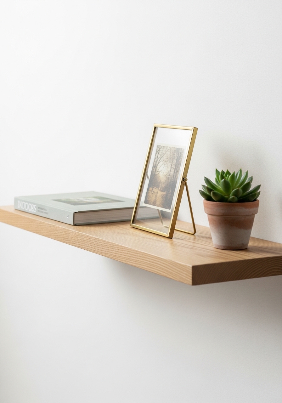 A single floating shelf styled with an odd number of objects reads intentional. I use white oak floating shelves and mix a small ceramic planter, a book, and a brass frame. Tip: keep tall items at one end, low items in front. Mistake to avoid: centering every object—offset for movement.
