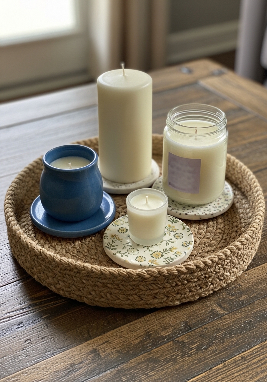 A woven tray keeps candles and remotes tidy and adds tactile warmth. I pair with handmade ceramic coasters. Mistake to avoid: using real candles without a tray—wax rings happen.