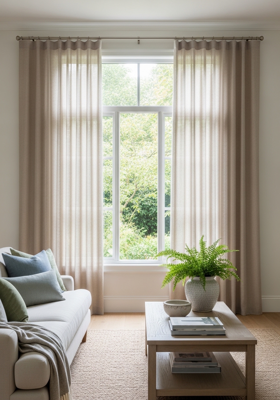 - Linen blend curtains, 84-inch (~$30-50 per panel)