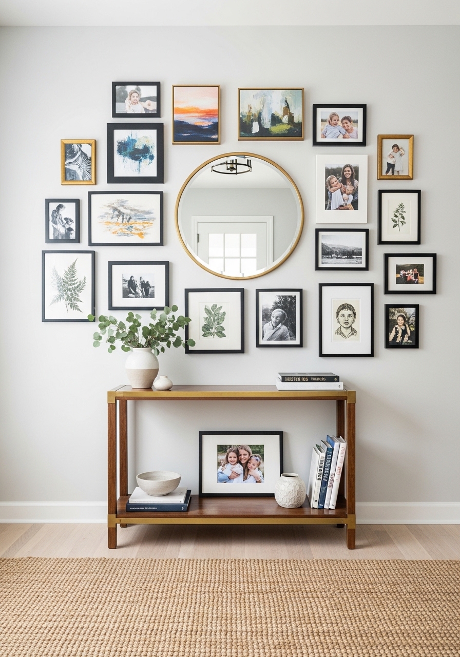 I thrifted frames and replaced mats for cohesion. Use odd numbers (5–7 pieces) and keep spacing at 2–3 inches. I paired vintage-style brass frames with new white mats. Avoid a crooked layout—map it on the floor before hanging.