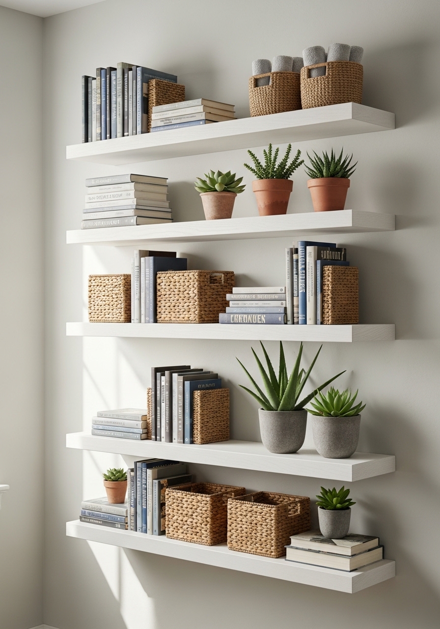 Floating shelves add depth without heavy furniture. I mixed books, ceramics, and small succulents. Use the rule of 3 for objects and vary heights for interest. Don’t overload—leave breathing room on each shelf.