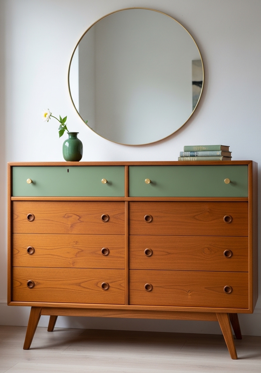 I repainted drawer fronts and swapped hardware on an old dresser. The change looked like a custom piece. I used brass knobs and satin eggshell paint. Keep two complementary colors max. Mistake: painting the entire piece the same color hides the shape.