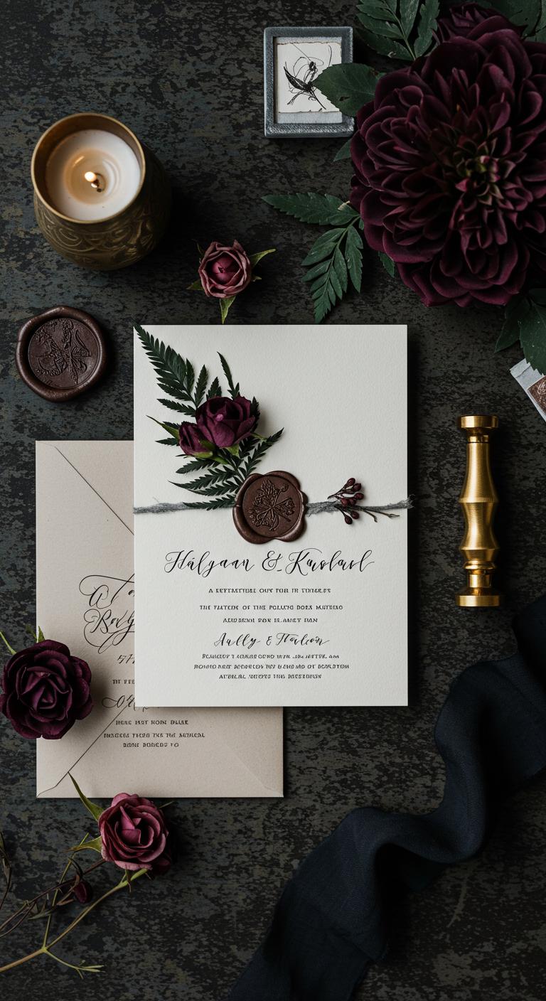 Create unique invitations by using dark paper and embellishing with nature items. Use twigs, dried leaves, or stamps to decorate the envelopes. You can choose an old-world font to enhance the theme. Handwritten notes add a personal touch. If you’re crafty, consider watercolor designs in deep colors. Print and fold into a card for a professional finish.