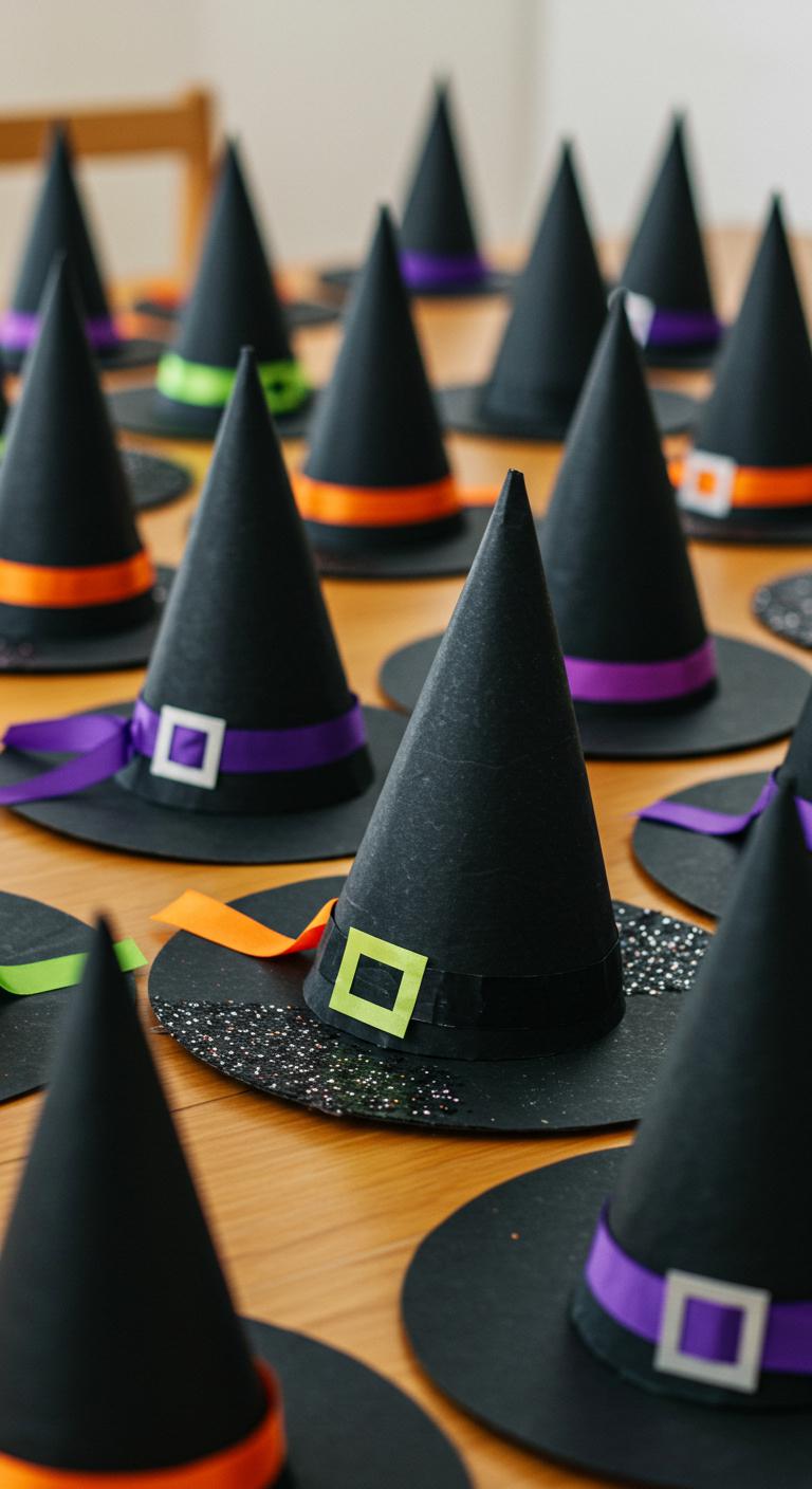 Create fun witch hats to decorate your party. Using black cardboard, cut out a triangle for the hat and a circle for the brim. Attach them together with tape or glue. Personalize with ribbons, glitter, or feathers. You can use them as table centerpieces or place them on chairs. They’re easy to make and can be customized for each guest. You can even make mini versions to hang around. This adds a playful touch to your decor.