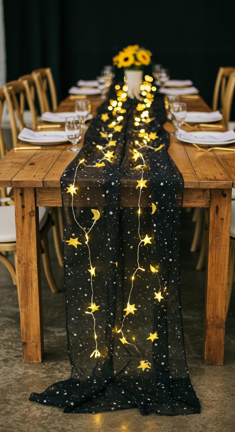 Use sheer black fabric as a table runner. It’s simple yet effective. Drape the fabric over your table and add touches like glitter stars or moon appliques. Add fairy lights to create a cozy glow. It’s a straightforward DIY project that transforms your dining space. For extra flair, layer different fabrics for depth. This can tie in with your overall theme, making your table look enchanting. Guests will be captivated by the ethereal touch.