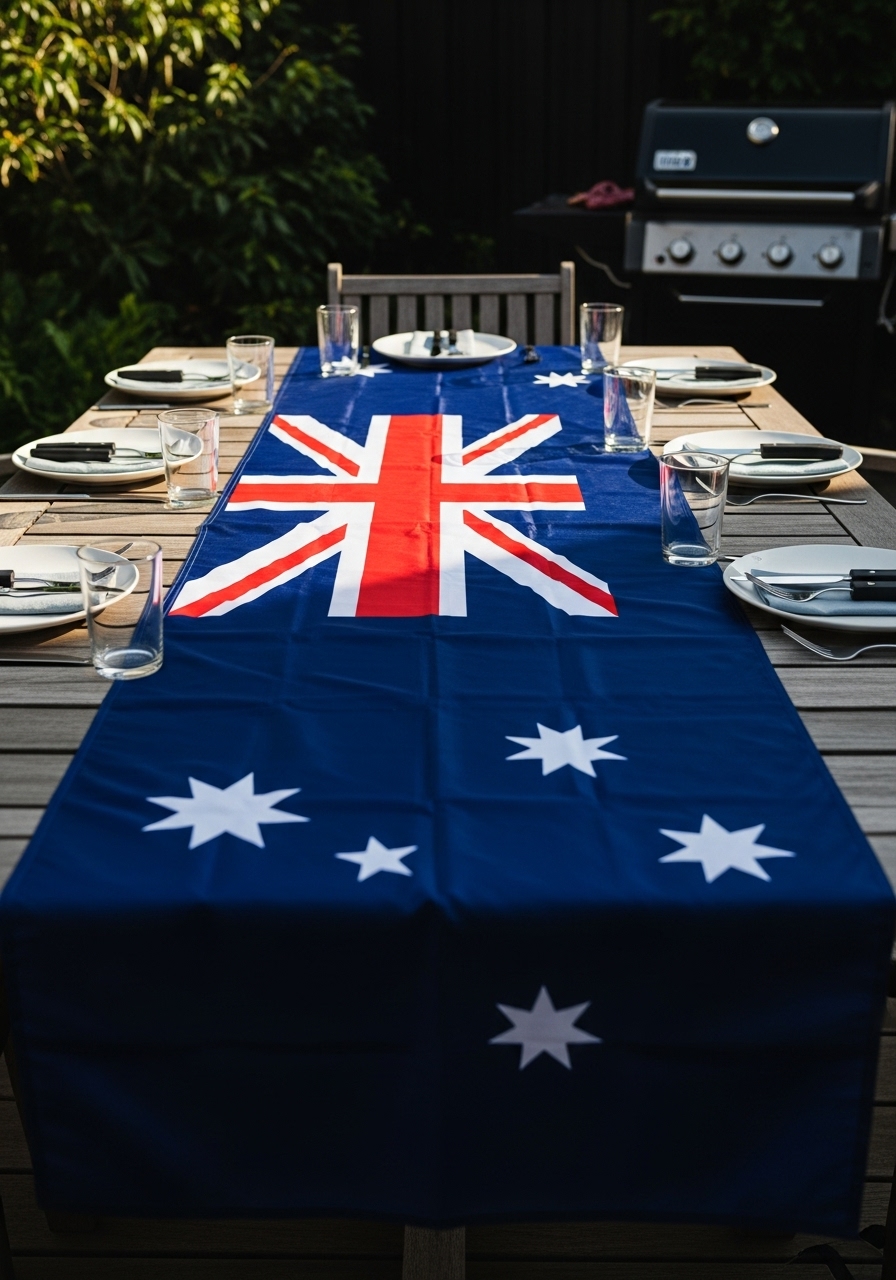 This works because the flag becomes a dramatic backdrop for white plates and clear glassware placed on either side. I don’t put anything directly on the flag—it’s purely decorative and runs the length of the table. Use clips or small weights at the corners to keep it from blowing if you’re outside. The key is buying a flag that’s actually fabric, not that thin plastic stuff from dollar stores that photographs terribly. After Australia Day, I store it folded and reuse it next year. The common mistake is draping flags vertically behind the table, which blocks conversation—horizontal along the table center keeps sightlines clear while maximizing patriotic impact.