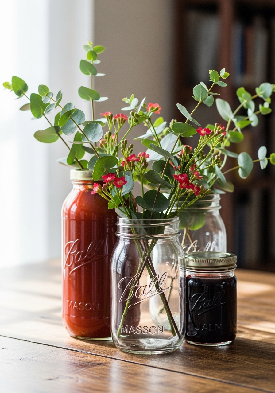 The key is removing labels completely using this label remover so they look intentional, not trashy. I fill them with artificial eucalyptus and small red flowers, then cluster 3-5 jars of varying heights down the table. This works because the mismatched containers feel authentic and Australian—casual, resourceful, unpretentious. Use odd numbers of jars and group them in clusters rather than spacing them evenly. The mistake is mixing too many jar styles; stick with clear glass only, no colored glass or different finishes.
