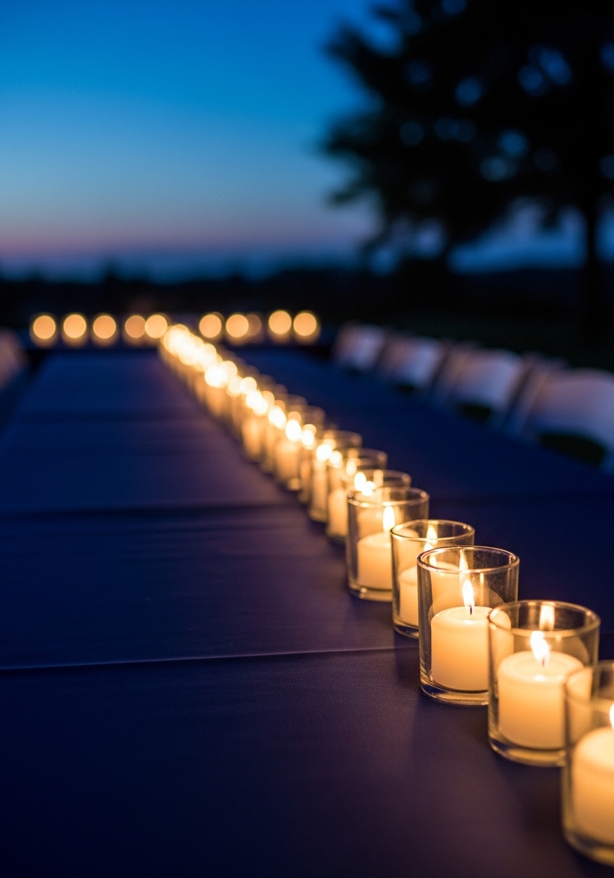Buy unscented white votives in bulk—scented candles compete with food smells. Place them in clear glass votive holders down the table center, spacing them every 18-24 inches. I mix candles with eucalyptus stems and mini flags for a layered centerpiece. The flickering light photographs beautifully at dusk. Never use candles in high wind—they’ll blow out constantly. For windy outdoor setups, switch to battery-operated tea lights that look identical to real candles.
