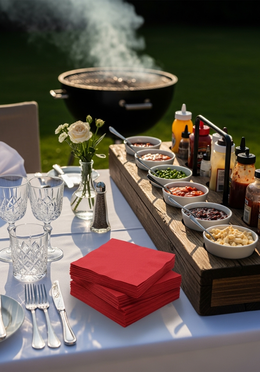 Stack paper napkins near saucy foods, grilled meats, or desserts. Guests appreciate having disposables for messy eating without ruining the cloth napkins at their place settings. Buy napkins in your table color scheme—red for patriotic themes, green for alternative palettes. I go through about 100 cocktail napkins for 10-12 guests at a full BBQ. The key is placement: don’t put them on the formal table, keep them at the serving station. This signals “use these for messy foods, save your cloth napkin for dinner.”