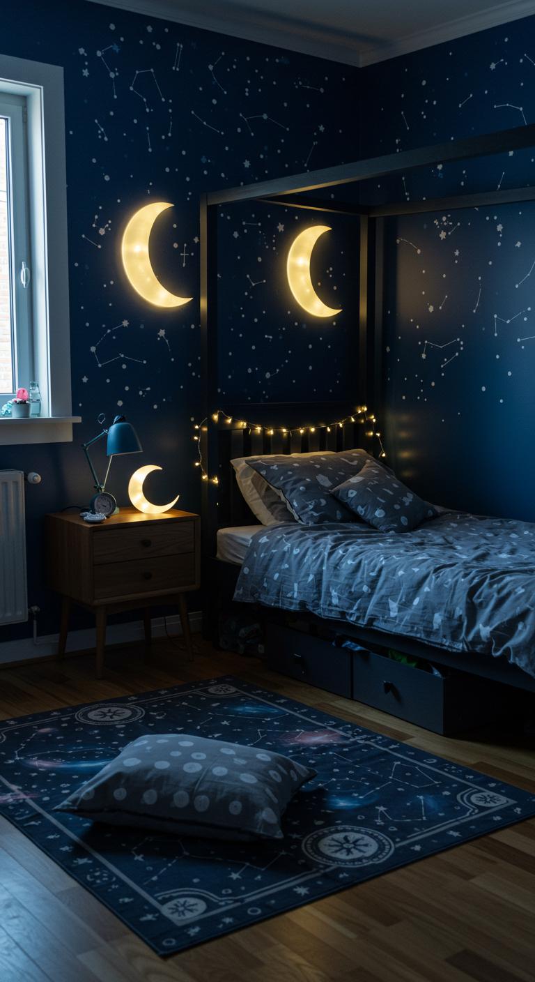 Transform your room into a nighttime sanctuary with celestial decor. Start by adding moon-shaped night lights to cast a gentle glow. Paint your walls in deep hues like navy or black to mimic the night sky. Enhance the look with star decals or wall art. Incorporate elements like a soft throw blanket in cosmic patterns or a rug with celestial motifs. This adds warmth while keeping the theme. If budget is a concern, consider DIYing your decor. Create your starry wall art with craft paint and a canvas. Simple yet effective, these touches will create a dreamy atmosphere.