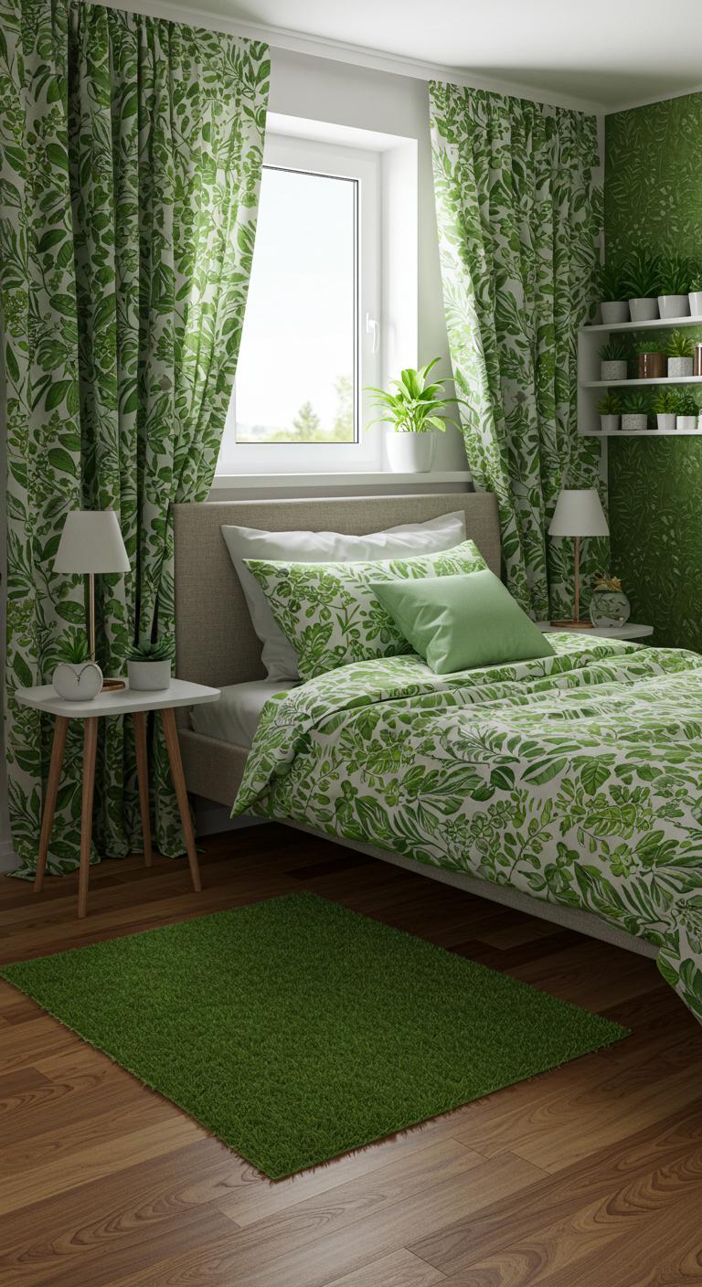 Bring the enchantment of the forest indoors with greenery. Use potted plants like ferns and succulents to breathe life into your space. Hang leafy print curtains to frame your windows and invite nature’s charm inside. A vibrant area rug mimicking forest colors can ground the space beautifully. If you’re on a budget, opt for low-cost plants that require minimal care. You can transform old accessories into planters by using paint or twine, giving your room a personalized touch. This creates a natural ambiance, making your bedroom feel both cozy and airy.