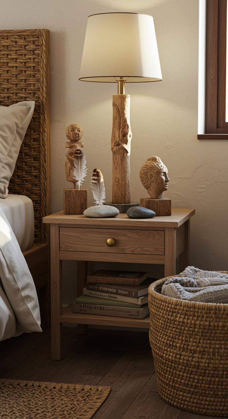 Incorporate nature-inspired details to keep your space connected to the earth. Display wooden sculptures, feathers, or stones as décor on tables or shelves to infuse the room with wild beauty. Use a woven basket to store blankets, adding texture. For a budget-friendly approach, collect items during nature walks or look for unique pieces at local markets. You can also craft decorations using branches or stones, creating a space that feels grounded and harmonized with nature.
