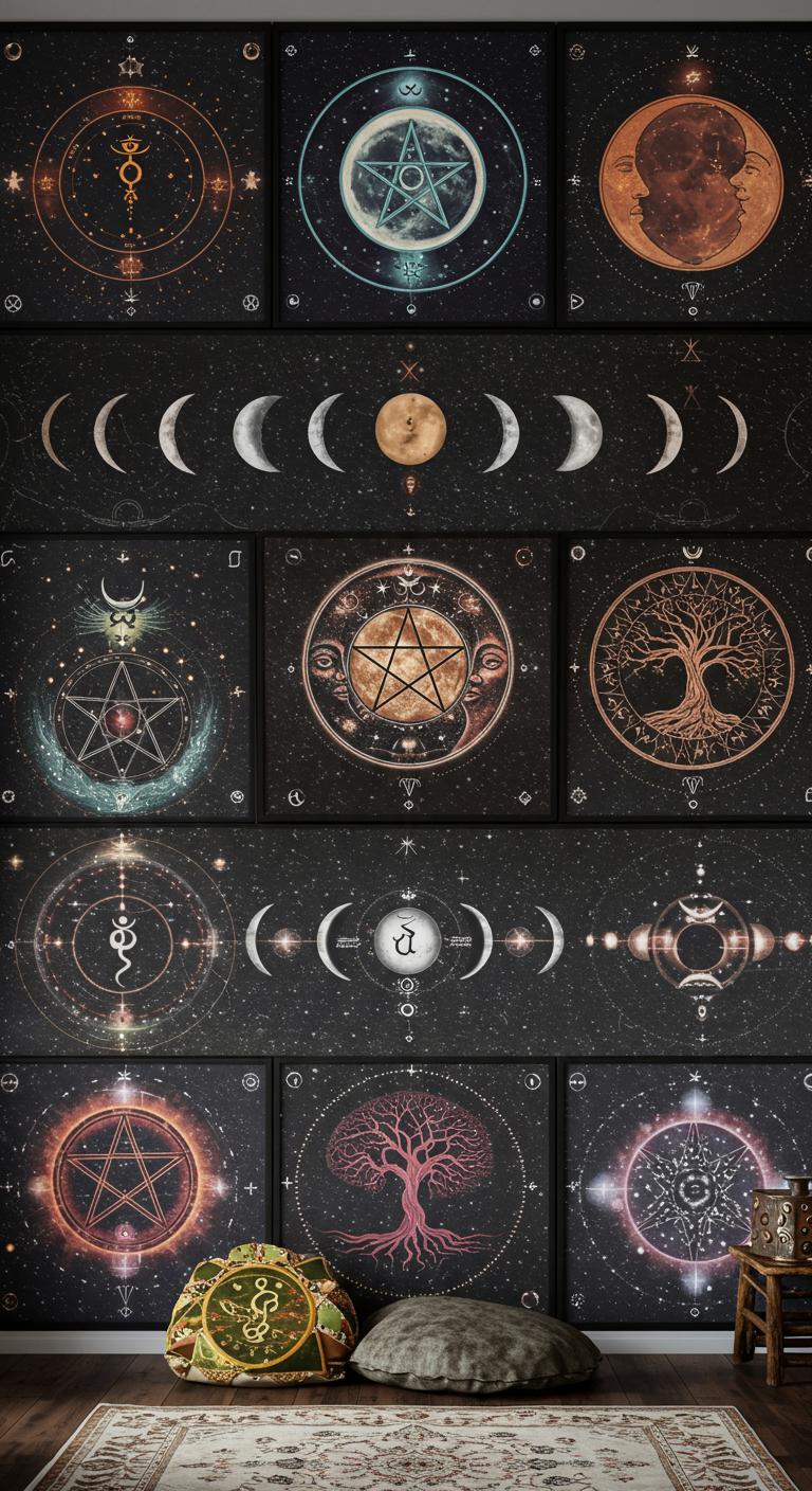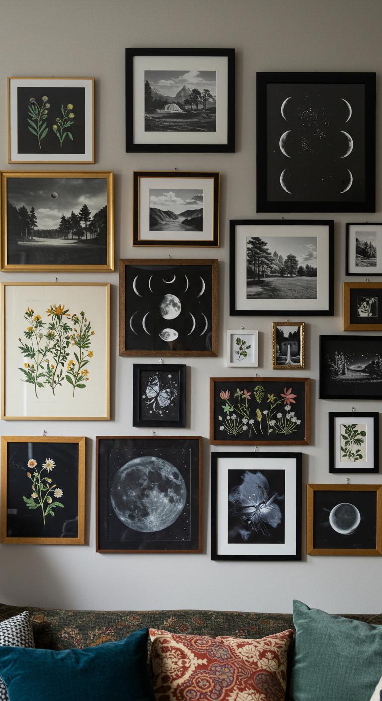 Create a personal gallery wall that showcases your style. Mix botanical prints, celestial phases, or your favorite art pieces to add enchanting elements. A gallery wall doesn’t need to be expensive; use thrifted frames or DIY them with craft supplies. You can even print your favorite images from online sources. Arrange them in a salon-style layout for a casual vibe. Consider adding a few mystical touches like dried flowers or crystals to the frames, enhancing the witchy feel.