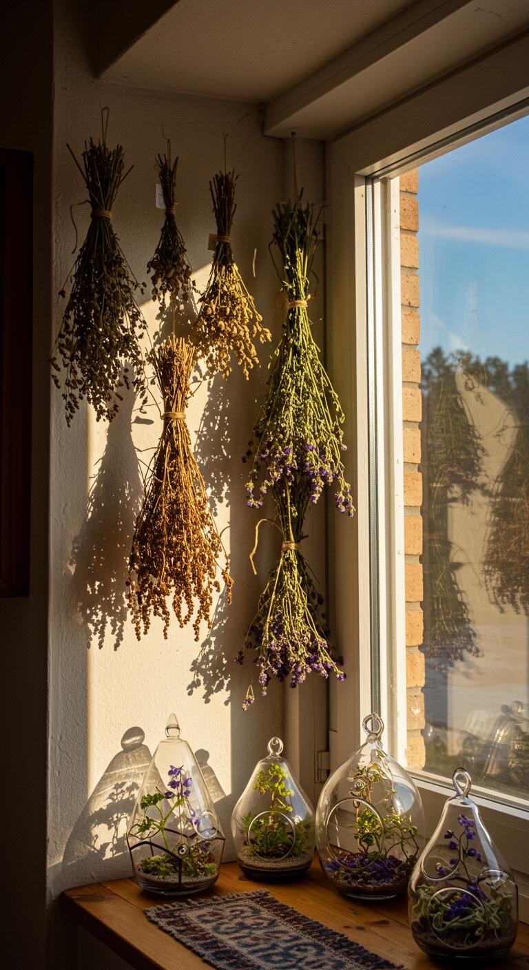 Design a cozy herbal corner to celebrate nature’s bounty. Use a window-sill to display dried herbs in creative arrangements. Hang bundles from the ceiling or display them in charming glass jars. Add a few terrariums with small plants to heighten the natural aesthetic. This is a wonderful way to fill your space with enchanting scents. Create DIY labels for jars using recycled materials to elevate your decor on a budget. The element of nature will add warmth to the room.