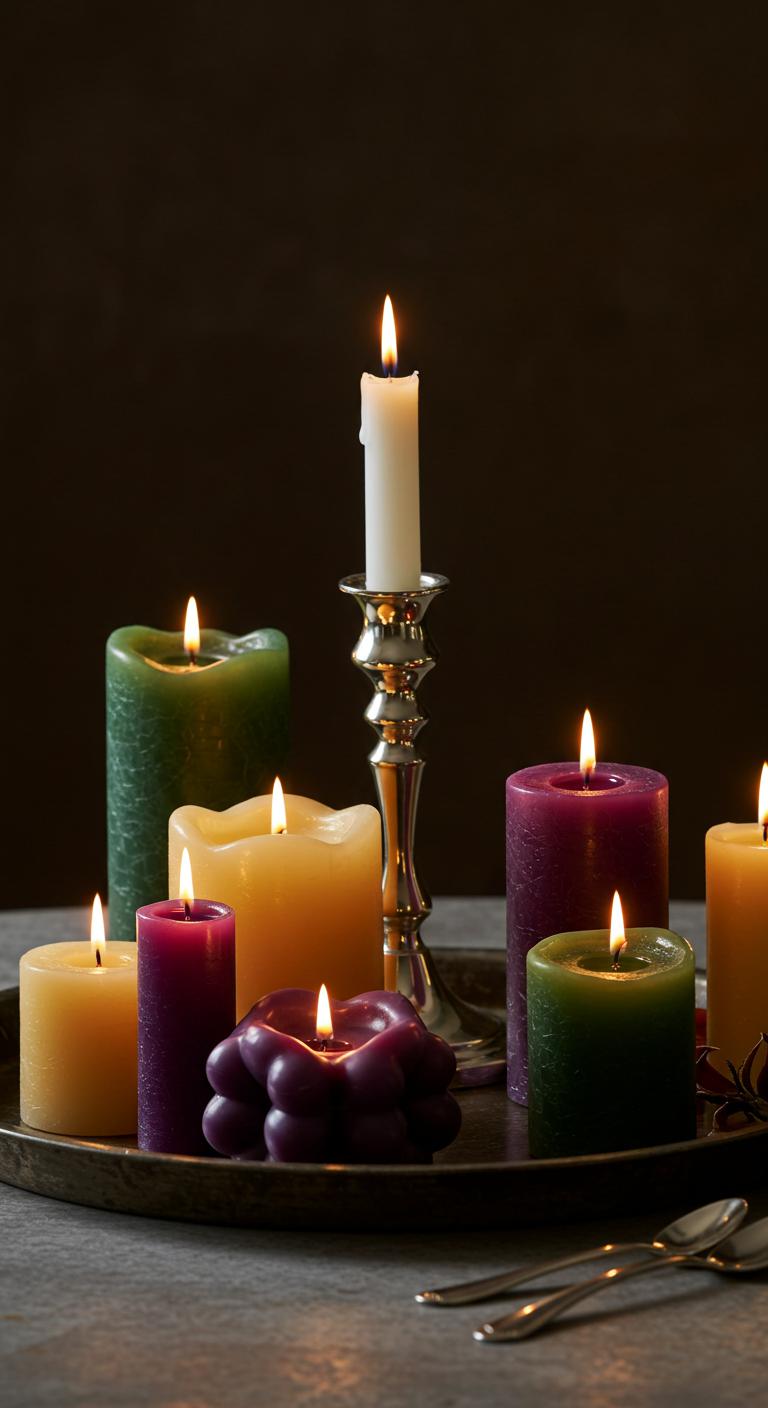 Candles are essential for a cozy, witchy vibe. Use various shapes and sizes to create an enchanting display. Choose candles in rich colors like deep purple, black, or emerald. Group them on a tray or mantel for a cohesive look. If you want to save money, explore DIY options. You can make your own candles using wax, wicks, and scents you adore. Pour them into vintage jars or fun molds. This adds personalization and atmospheric warmth.