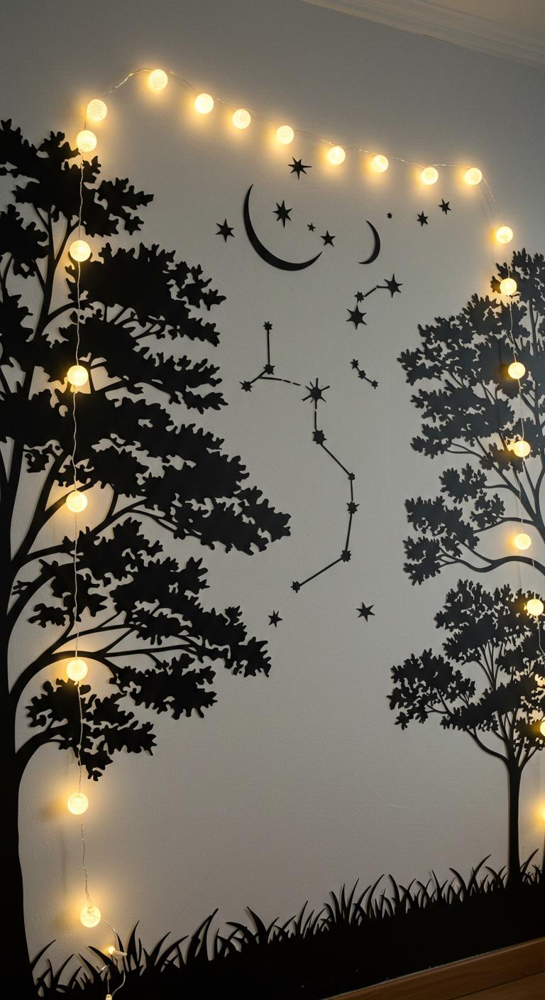 Create a magical atmosphere with illuminated silhouettes on your wall. Use black paper to cut out shapes like trees or celestial designs. Attach them to your wall using removable adhesive strips. For an enchanting touch, outline them with string lights. This adds a cozy glow perfect for witchy gatherings. This DIY is affordable and lets you express creativity in your decor. Lights can be adjusted seasonally, providing versatility throughout the year.