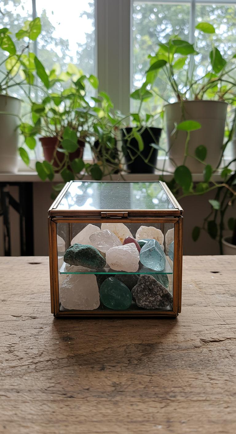 Display your crystal collection in a vintage glass box. These boxes add elegance to your decor and keep your crystals safe. Try thrift stores or online platforms for unique finds. Arrange the crystals by color or type for added impact. Place it on a shelf or table where sunlight can reflect off the surfaces beautifully. This idea easily combines functionality with style while celebrating your magical interests.