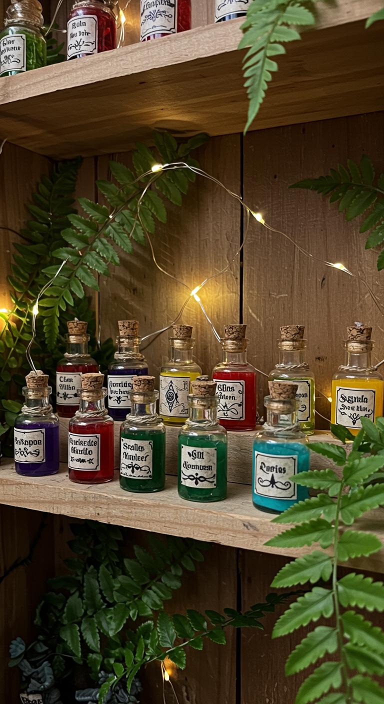 Miniature potion bottles can serve as whimsical decor. Fill them with colored water, herbs, or beads to imitate potions. Design custom labels to enhance the potion theme. Arrange these bottles on floating shelves or in a cabinet for added visual appeal. This easy project allows you to tap into your creativity—try different color combinations for each bottle. These little details contribute to a cohesive witchy decor theme that reflects your personality.