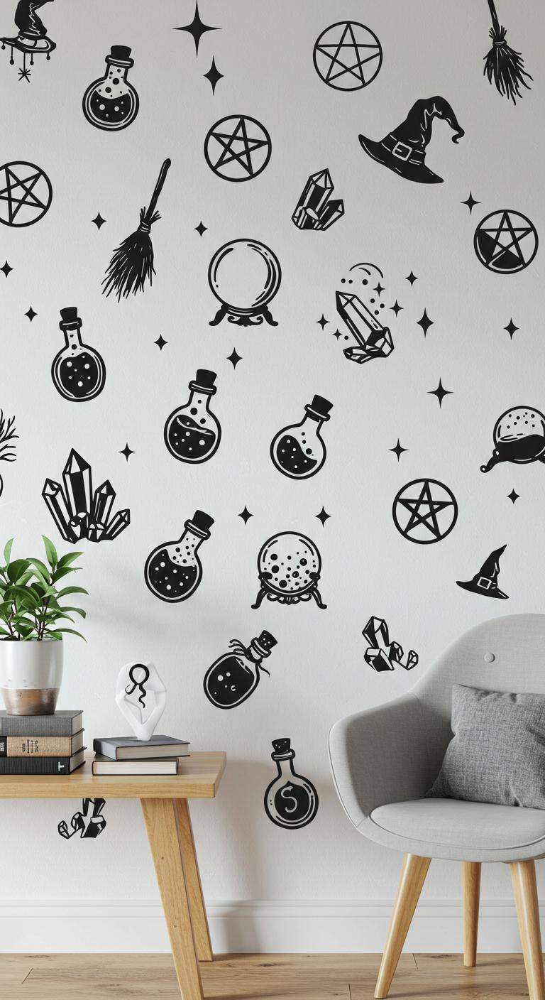 Wall stickers are a quick and mess-free way to add some witchy charm. Choose designs that reflect your personality—think potions, moons, or witch hats. They’re easily removable, making them perfect for temporary decor. Look for vinyl stickers that can be repositioned without damaging your walls. Mixing and matching different symbols can create a playful, personalized design. Consider pairing them with other decorative art for added depth and texture.