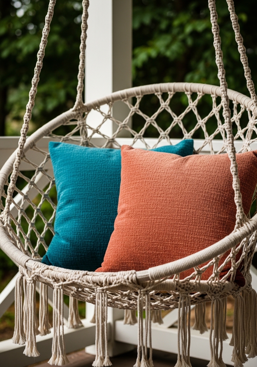 I hung a cream macramé chair (48–52" full-length) that became my favorite spot. I paired it with terracotta lumbar pillows and cream macramé chair priced around $120–$180. The look reads relaxed. In photos, too many pillows can look styled; in real life two medium and one small pillow works. Styling tip: vary heights—one tall back pillow, one small lumbar. Mistake: hanging too low. Keep seat at knee height for easy in/out.