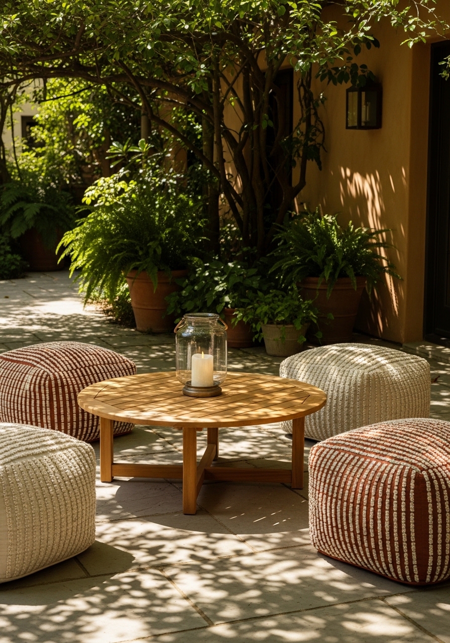 I found a 36" round teak low table that grounds the seating area. I paired it with teak coffee table and woven floor poufs. Prices run $180–$450. The result is casual and invites conversation. Real life: sturdy wood resists spills; photos rarely show water rings. Styling tip: odd-numbered tabletop groupings. Mistake: too-small table for guests—aim for at least 36" diameter.
