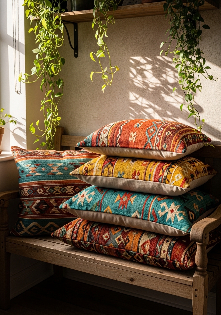 I used kilim cushions in teal, rust, and mustard to add pattern without clutter. I recommend kilim seat cushions and rust throw pillow covers. Expect $40–$120 per cushion. The mix hides dirt well. In photos, patterns can read busy; real life handles stains better with darker palettes. Styling tip: repeat one color across three cushions for cohesion. Mistake: matching every pattern—mix scale and keep colors shared.