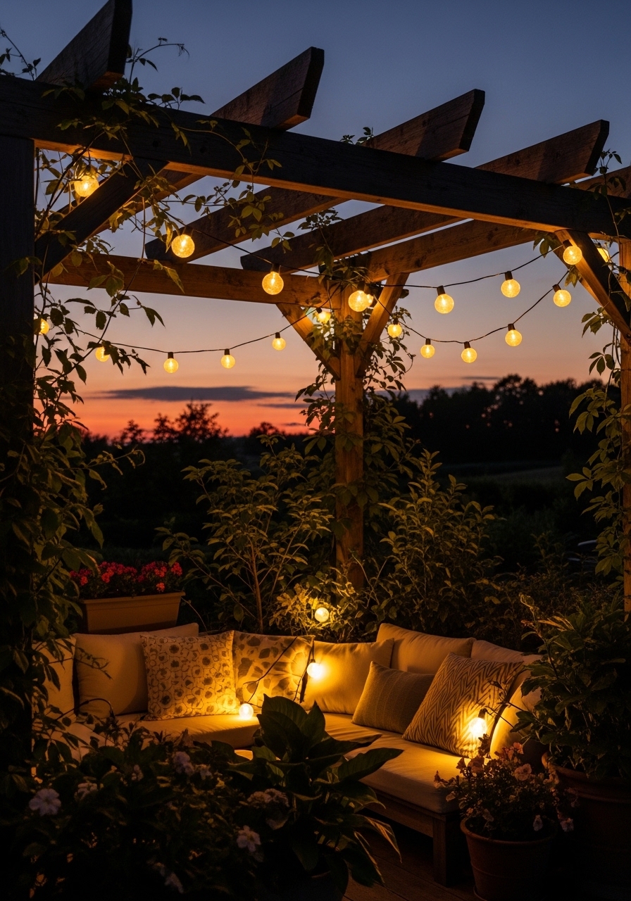 I draped warm LED globe strings around my pergola. I bought outdoor globe string lights and solar lanterns. Cost: $25–$70. The glow extends summer nights. Photos can over-glow; in person, choose warm 2200–2700K bulbs. Styling tip: hang higher than eye level to avoid glare. Mistake: using indoor cords outdoors—pick weatherproof rated lights.
