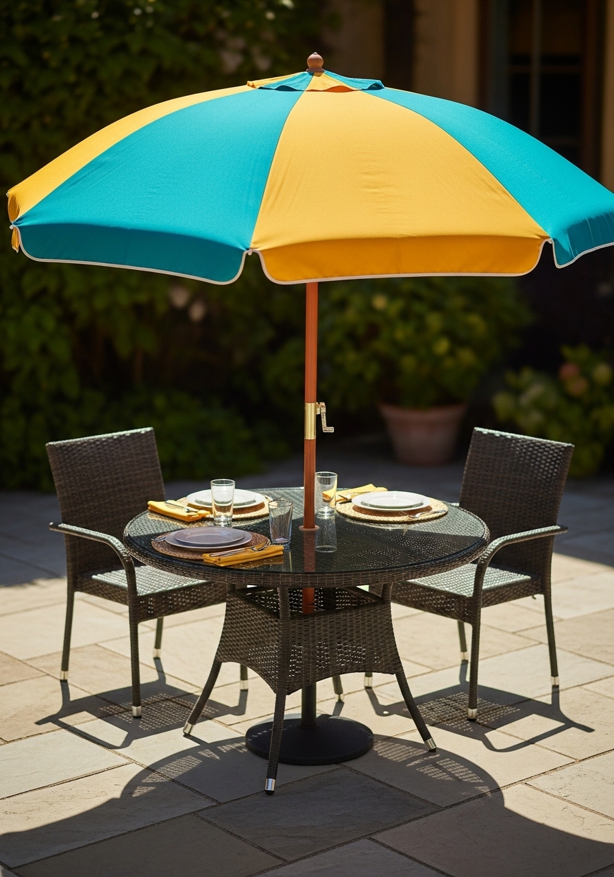 I chose a teal-and-mustard color-block umbrella (7–9 ft) to anchor my dining set. Shop 7 ft patio umbrella and outdoor table set. Cost: $80–$220. It shields midday sun and defines the area. Photos may hide tilt mechanisms; in real life test the tilt and wind rating. Styling tip: pick umbrella fabric with UV rating. Mistake: mismatched scale—small umbrellas vanish with big tables.