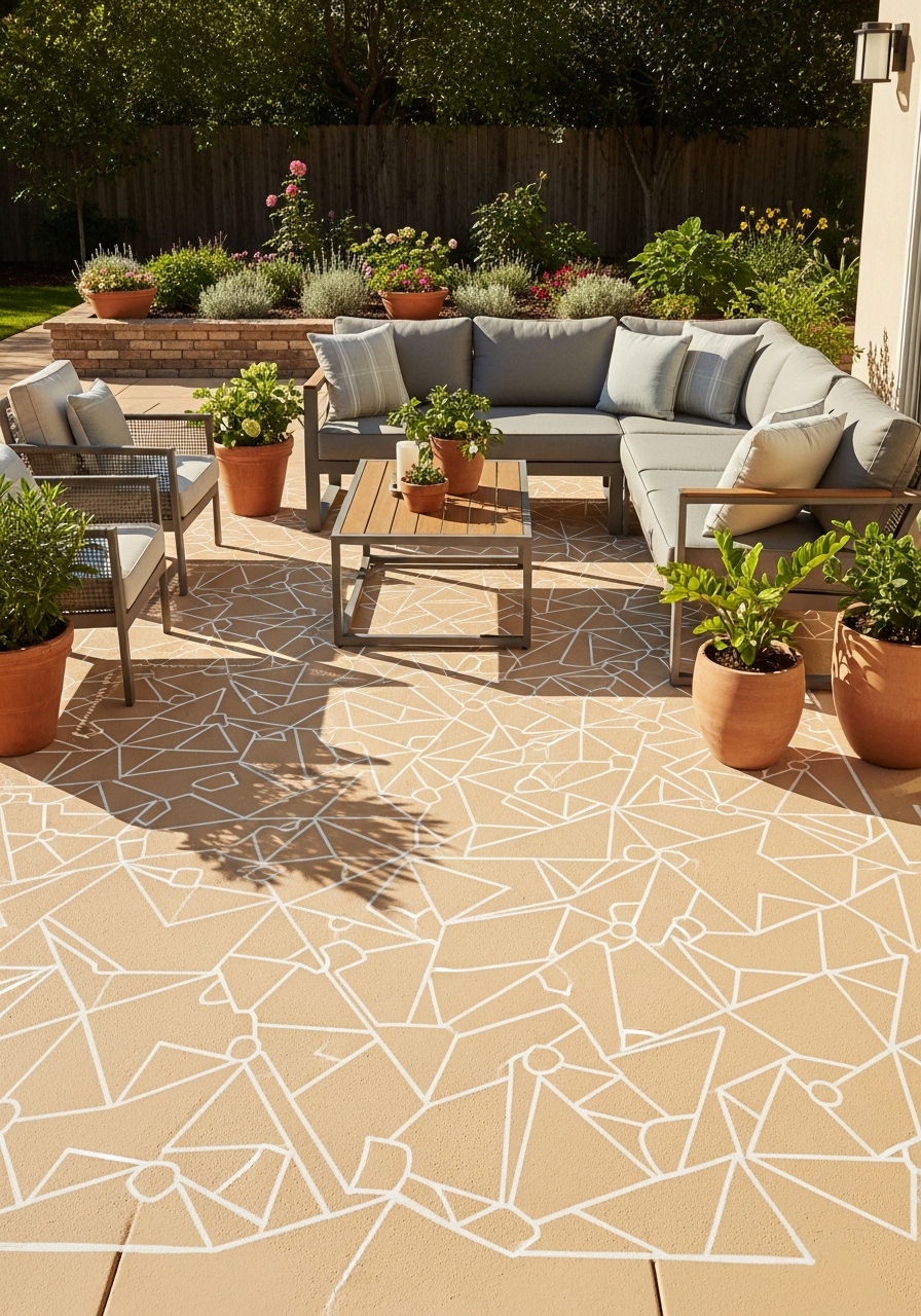 I painted my concrete in sand tone and used a white geometric stencil for interest. I linked outdoor floor paint and stencil sheets. Cost: $50–$140. It ties other colors together. Photos hide imperfections; real life shows brush marks—use rollers and multiple coats. Styling tip: choose colors that read warm when wet. Mistake: skipping primer on old concrete.