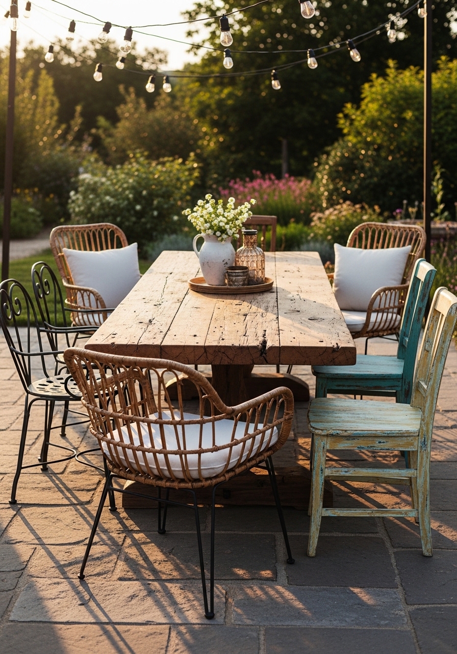 I mixed metal bistro chairs, a rattan bench, and a painted spindle chair around a reclaimed table. Links: reclaimed wood table and metal bistro chairs. Expect $200–$600. The variety feels collected. In photos, mismatched can look curated; in reality, pick a unifying color. Styling tip: paint one repeated color for cohesion. Mistake: too many different scales—keep chair heights similar.
