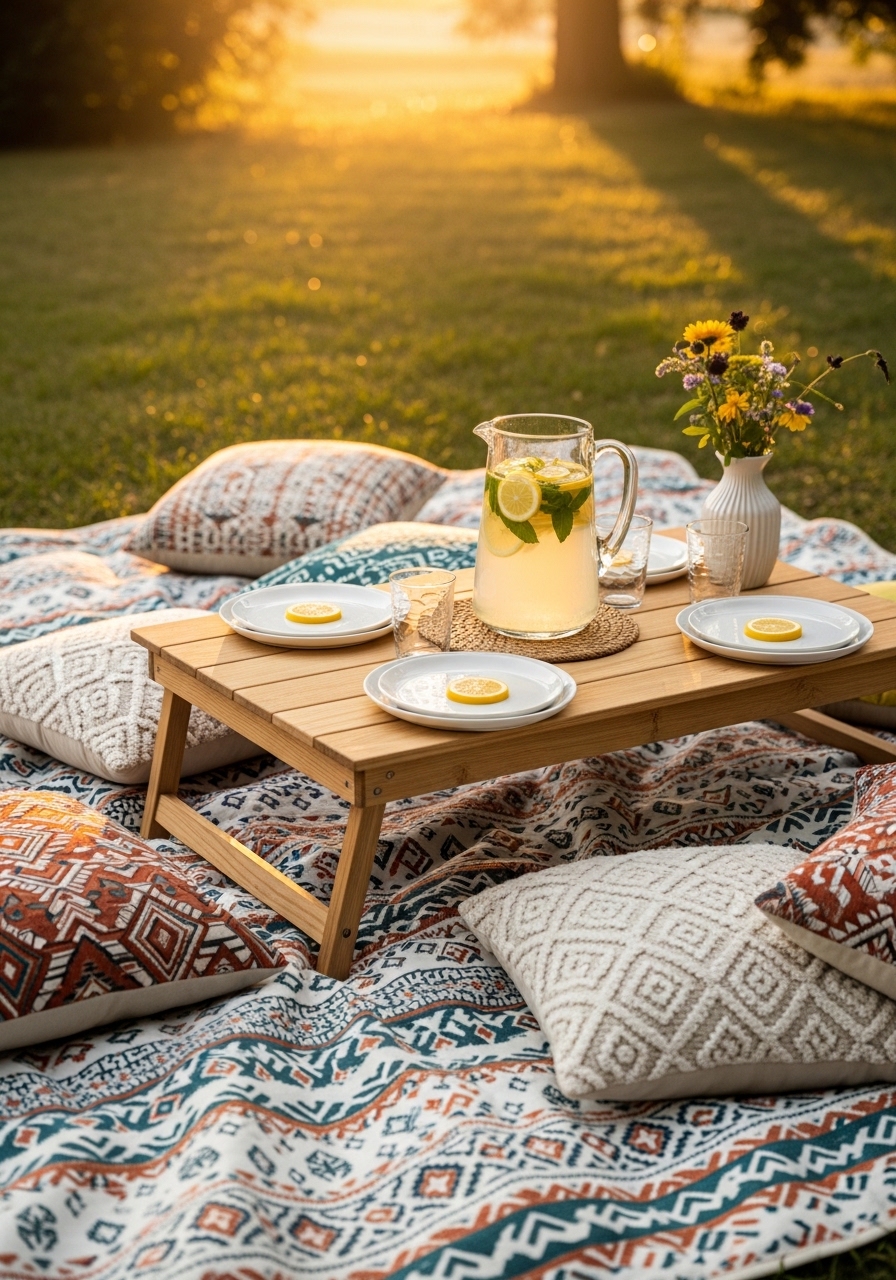 I keep a 72×72 cotton picnic blanket and a 30" low fold table for casual gatherings. I link 72×72 picnic blanket and folding low table 30 inch. Cost: $30–$120. The set feels effortless and social. Photos show perfect layouts; real life needs weight to stop wind—use clips or rocks. Styling tip: anchored center piece keeps things steady. Mistake: too-small blanket for guests—choose at least 72" square.
