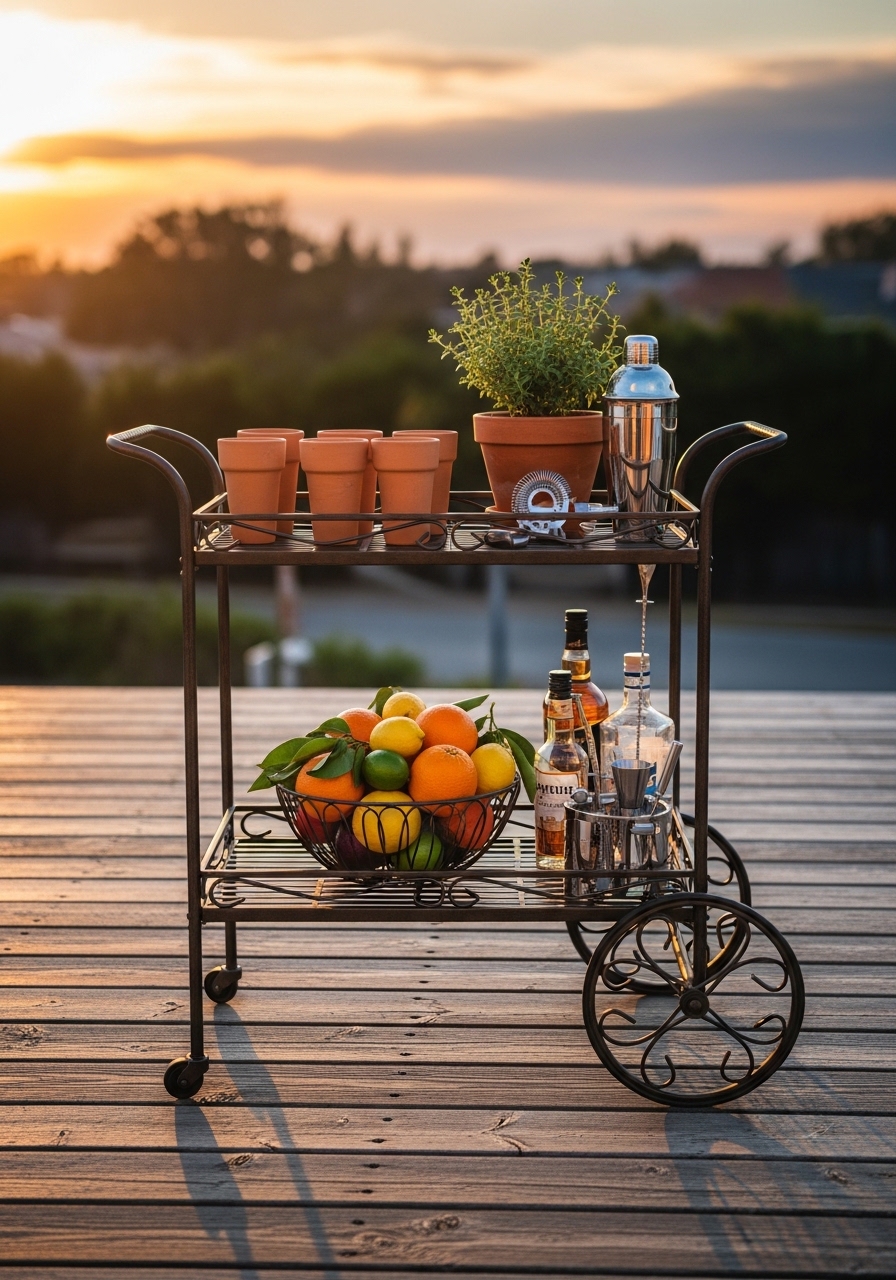 I added a weatherproof metal bar cart with a teak top for sunset drinks. I recommend outdoor bar cart and terracotta cocktail glasses. Price: $120–$350. It becomes a focal point for gatherings. Photos often show pristine glassware; outdoors choose unbreakable options. Styling tip: keep a tray of essentials. Mistake: overloading the cart—store heavy bottles low.