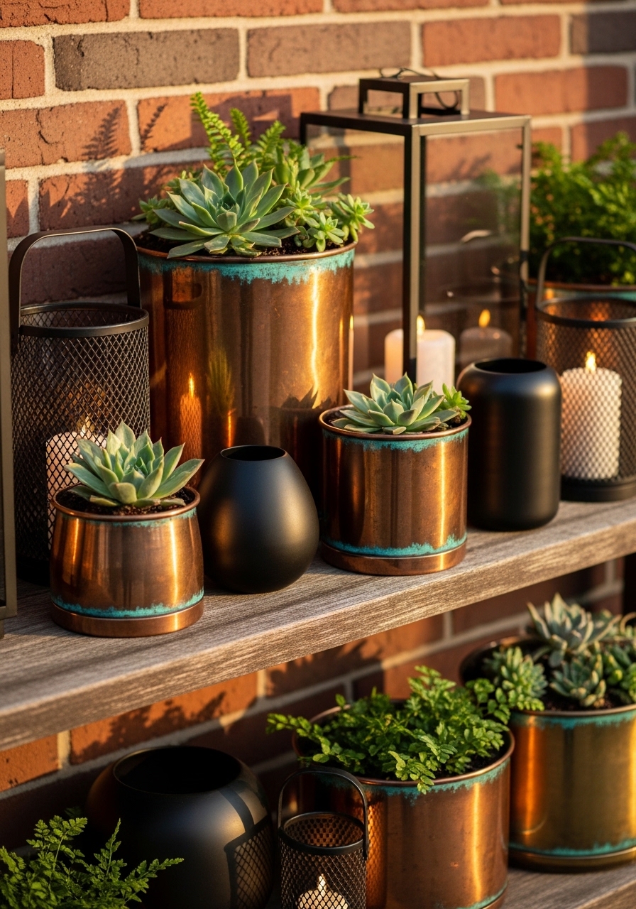 I mix copper, brass, and matte black planters and lanterns for depth. I linked copper planters set and matte black lanterns. Cost: $40–$150. Metals catch sun and add luxury without being formal. Photos can over-gleam; in person, patina adds character. Styling tip: repeat one metal in threes. Mistake: using shiny metals exclusively—mix finishes.
