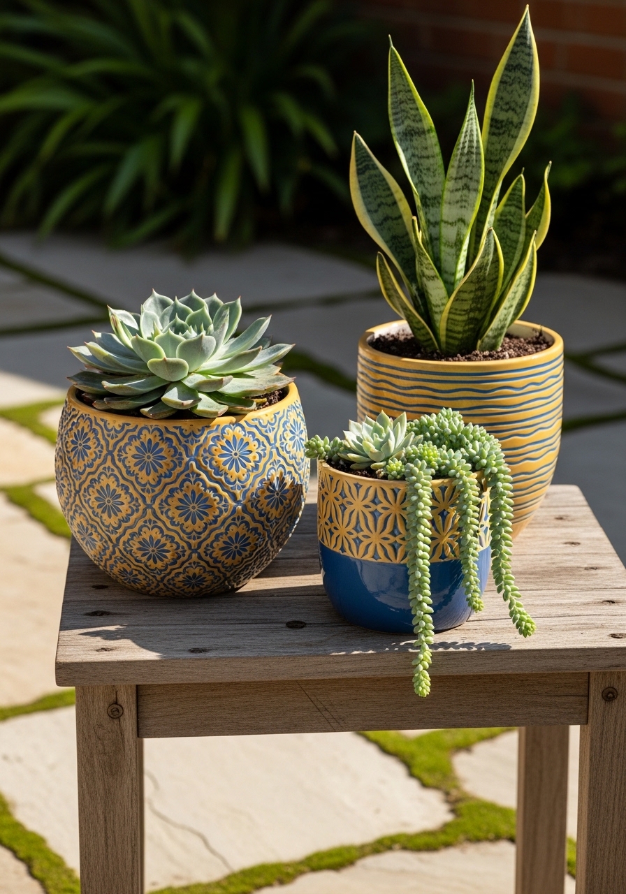 I grouped ceramic planters with hand-painted patterns in blue and mustard. I linked patterned ceramic planter and mustard outdoor cushion. Cost: $60–$200. The tiles add artisanal detail. Photos may conceal chips; choose weather-safe glaze for outdoors. Styling tip: balance pattern with plain textures nearby. Mistake: too many tiny patterns—scale matters.