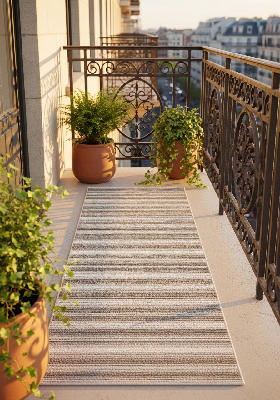 I use a 2.5×8 outdoor runner to define my balcony path. I linked 2.5×8 outdoor runner and balcony plant stand. Cost: $35–$120. It elongates space visually. Photos make runners look flat; in person choose low-pile for traffic. Styling tip: center runner with planters at ends. Mistake: picking a runner too narrow—aim for at least 24" wide.