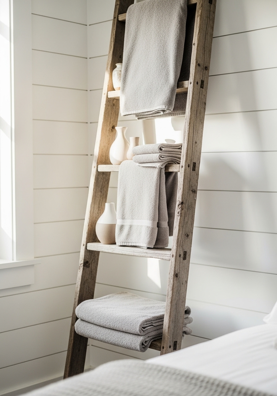 Lean a vintage ladder against the wall for instant storage and display – it’s a fresh take on boho farmhouse that adds height without cluttering the floor. I picked one up at a flea market and styled it with my favorite books and succulents; it feels so personal and adds that cozy, collected-over-time aesthetic. You might drape a light scarf over it for extra texture. It’s super easy to DIY if you’re feeling crafty.