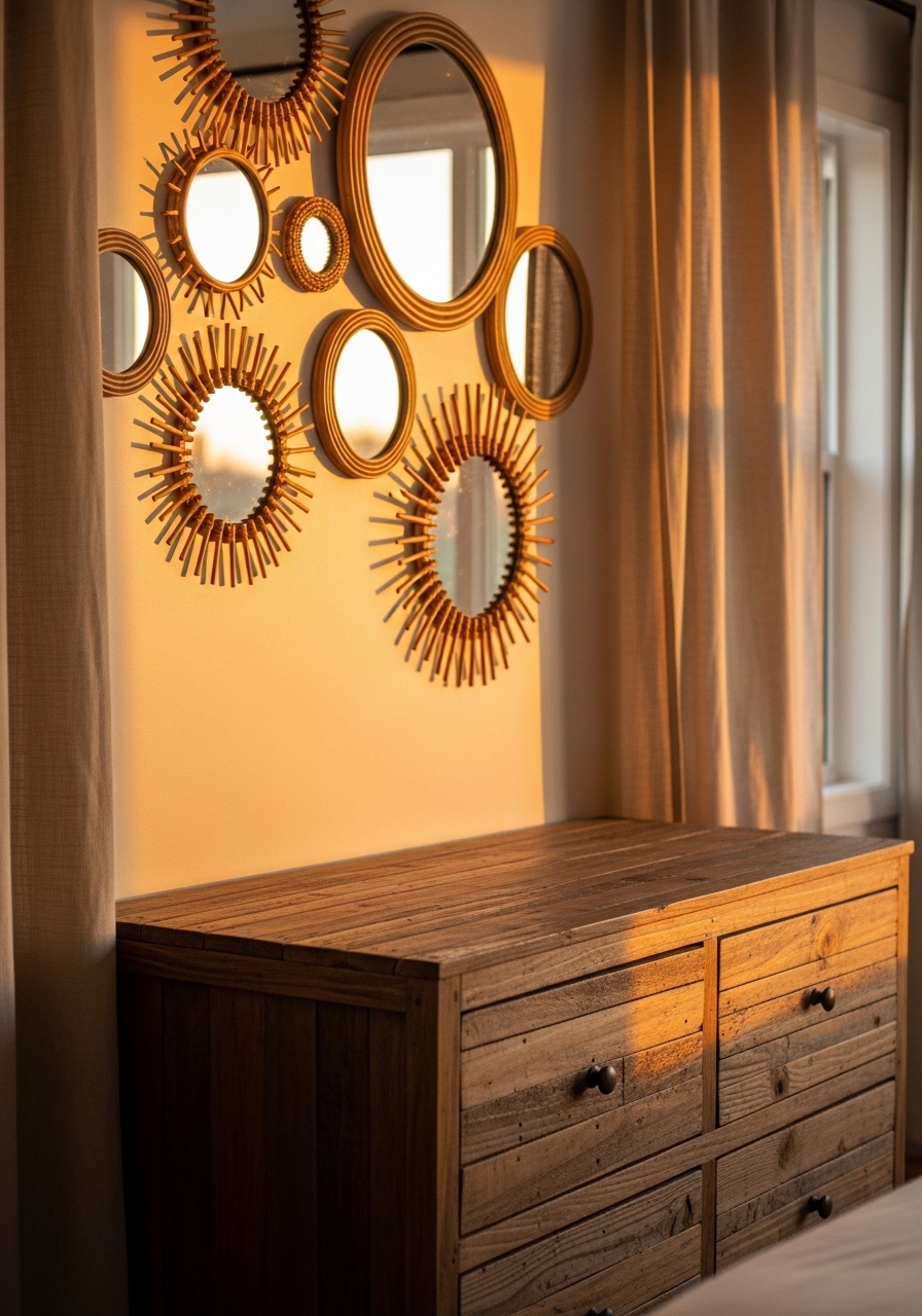 Group rattan mirrors in varying sizes for a boho reflection play that bounces light around your farmhouse bedroom. I hung a set in my space, and it makes the room feel bigger and more whimsical – plus, they’re great for checking outfits on the fly. Layer with some dried eucalyptus for scent and texture.