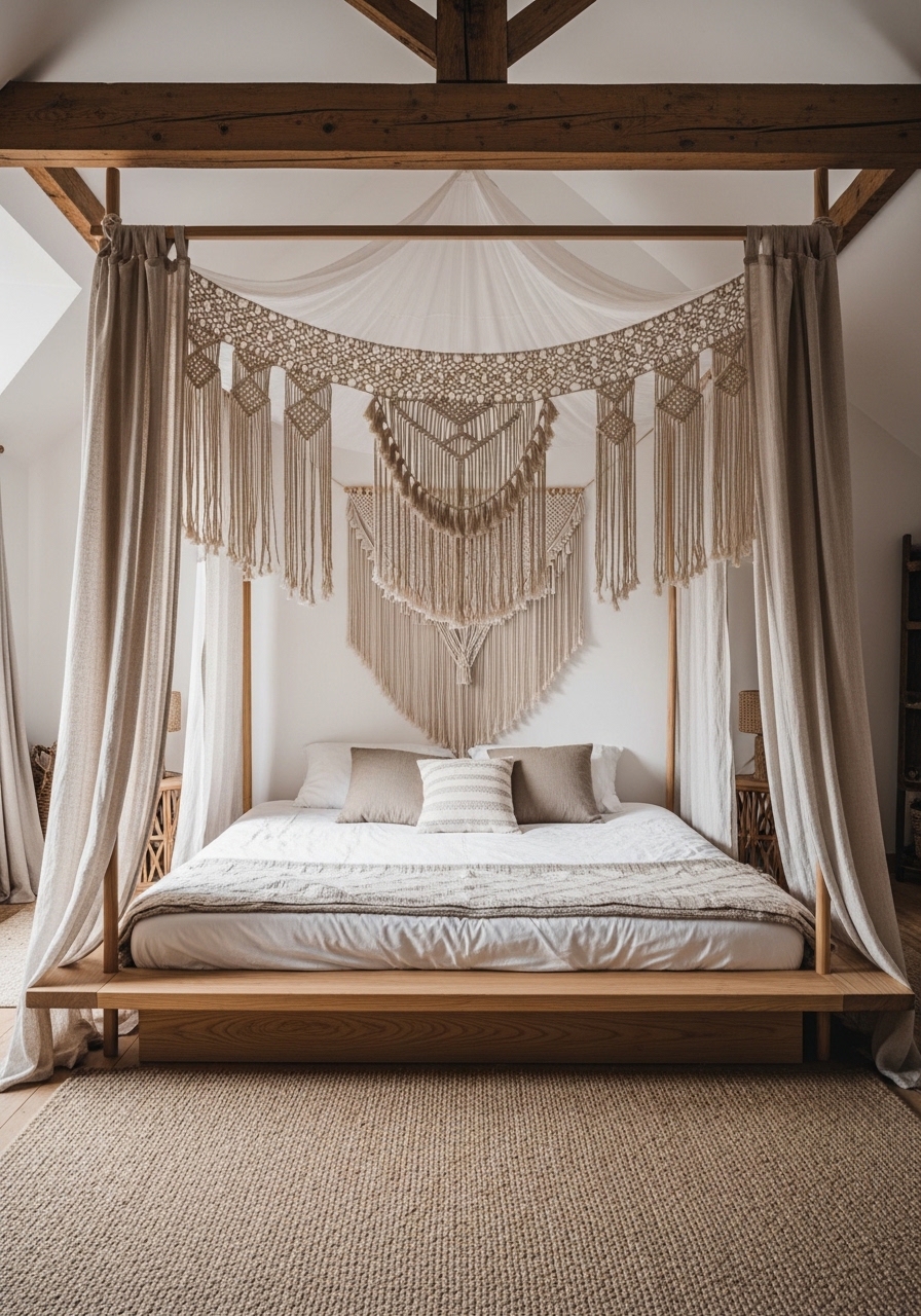 Drape a handmade macrame canopy over your bed for that dreamy boho layer in a farmhouse setting – it’s like sleeping under stars without leaving home. I made one from yarn scraps, and though it took a weekend, the soft sway adds such romance. Pair it with fairy lights for evenings, and you’ll never want to get up.